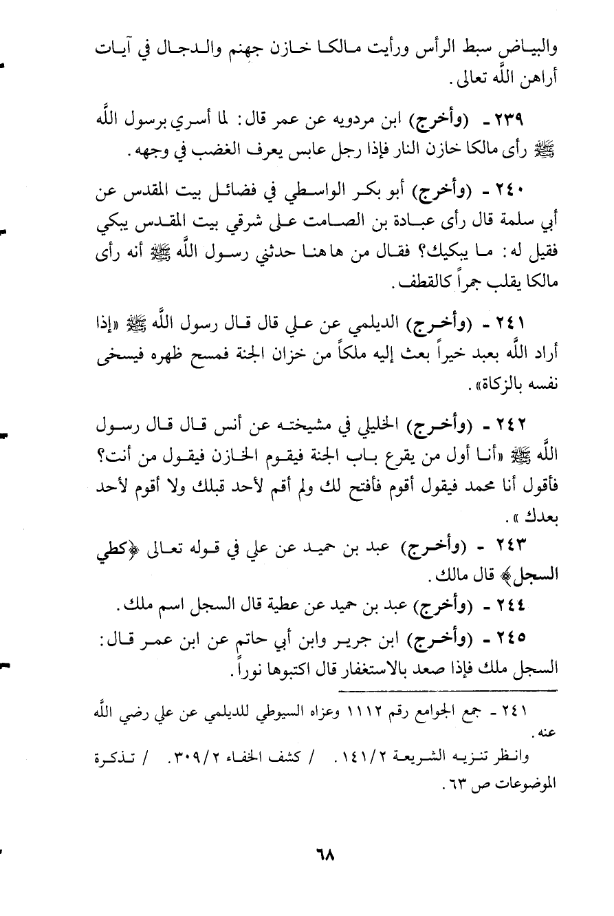 وأخرج أبو بكر الواسطى في فضائل بيت المقدس عن أبى سلمة قال: رئى عبادة بن الصامت على شرقى بيت المقدس يبكى فقيل له: ما يبكيك؟ فقال: من ههنا حدثني رسول الله صلى الله عليه وسلم: أنه رأى مالكا يقلب جمرا كالقطف.