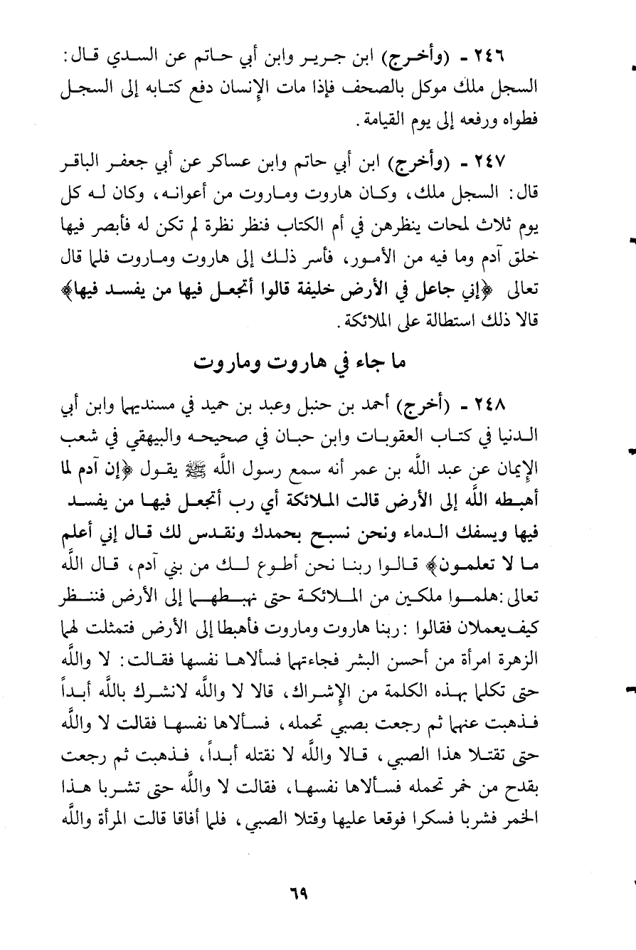 وأخرج ابن أبى حاتم وابن عساكر عن أبى جعفر الباقر قال: السجل ملك، وكان هاروت وماروت من أعوانه، وكان له كل يوم ثلاث لمحات ينظرهن في أم الكتاب فنظر نظرة لم تكن له، فأبصر فيها خلق آدم وما فيه من الأمور، فأسر ذلك إلى هاروت وماروت فلما قال تعالى: (إِنى جاعِلٌ في الأَرضِ خَليفَة قالوا أَتَجعَلُ فيها مَن يُفسِدُ فيها)) البقرة: 30 (قالا: ذلك استطالة على الملائكة.