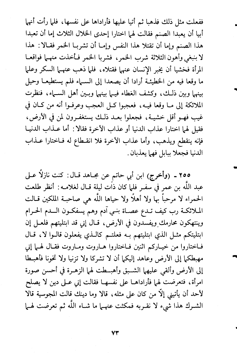 ففعلت مثل ذلك، فذهبا ثم أتيا عليها فأراداها على نفسها، فلما رأت أنهما أبيا أن يعبدا الصنم فقالت لهما: اختارا إحدى الخلال الثلاث: إما أن تعبدا هذا الصنم، وإما أن تقتلا هذا النفس، وإما أن تشربا الخمر فقالا: هذا لا ينبغى وأهون الثلاثة شرب الخمر، فشربا الخمر فأخذت منهما فواقعا المرأة فخشيا أن يخبر الإنسان عنهما فقتلاه، فلما ذهب عنهما السكر وعلما ما وقعا فيه من الخطيئة أرادا أن يصعدا إلى السماء فلم يستطيعا، وحيل بينهما وبين ذلك، وكشف الغطاء فيما بينهما وبين أهل السماء، فنظرت الملائكة إلى ما وقعا فيه، فعجبوا كل العجب وعرفوا أنه من كان في غيب فهو أقل خشية، فجعلوا بعد ذلك يستغفرون لمن في الأرض، فقيل لهما اختارا عذاب الدنيا أو عذاب الآخرة فقالا: أما عذاب الدنيا فإنه ينقطع ويذهب، وأما عذاب الآخرة فلا انقطاع له فاختارا عذاب الدنيا فجعلا ببابل فهما يعذبان.