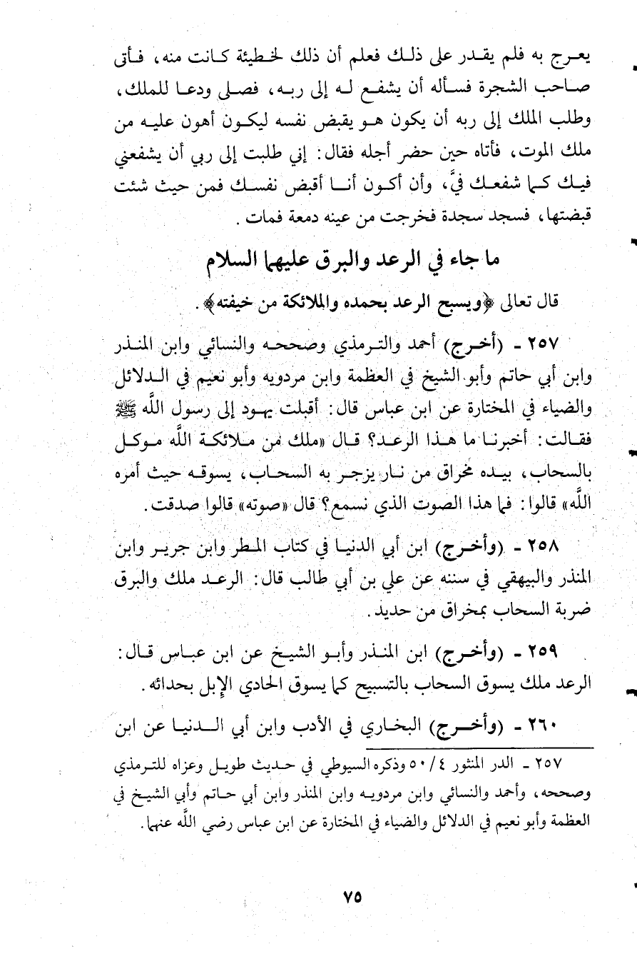 وأخرج ابن أبى الدنيا في كتاب المطر، وابن جرير، وابن المنذر، والبيهقى في سننه عن علي بن أبى طالب قال: الرعد ملك والبرق ضربه السحاب بمخراق من حديد.