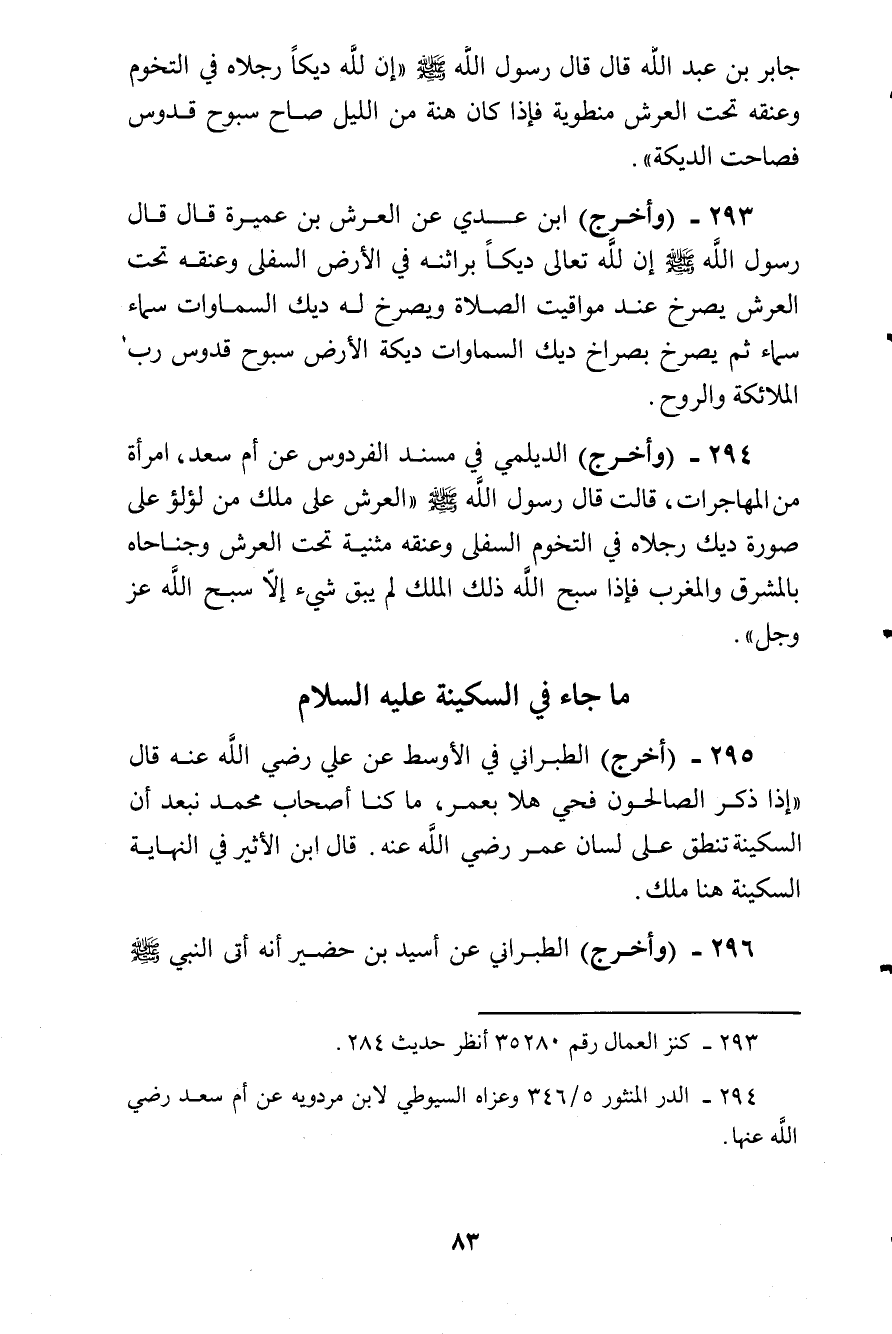 وأخرج الديلمى في مسند الفردوسن عن أم سعد امرأة من المهاجرات قالت: قال رسول الله صلى الله عليه وسلم:) العرش على ملك من لؤلؤ على صورة ديك، رجلاه في التخوم السفلى، وعنقه مثنية تحت العرش، وجناحاه بالمشرق، والمغرب، فإذا سبح الله ذلك الملك لم يبق شىء إلا سبح الله عز وجل (.