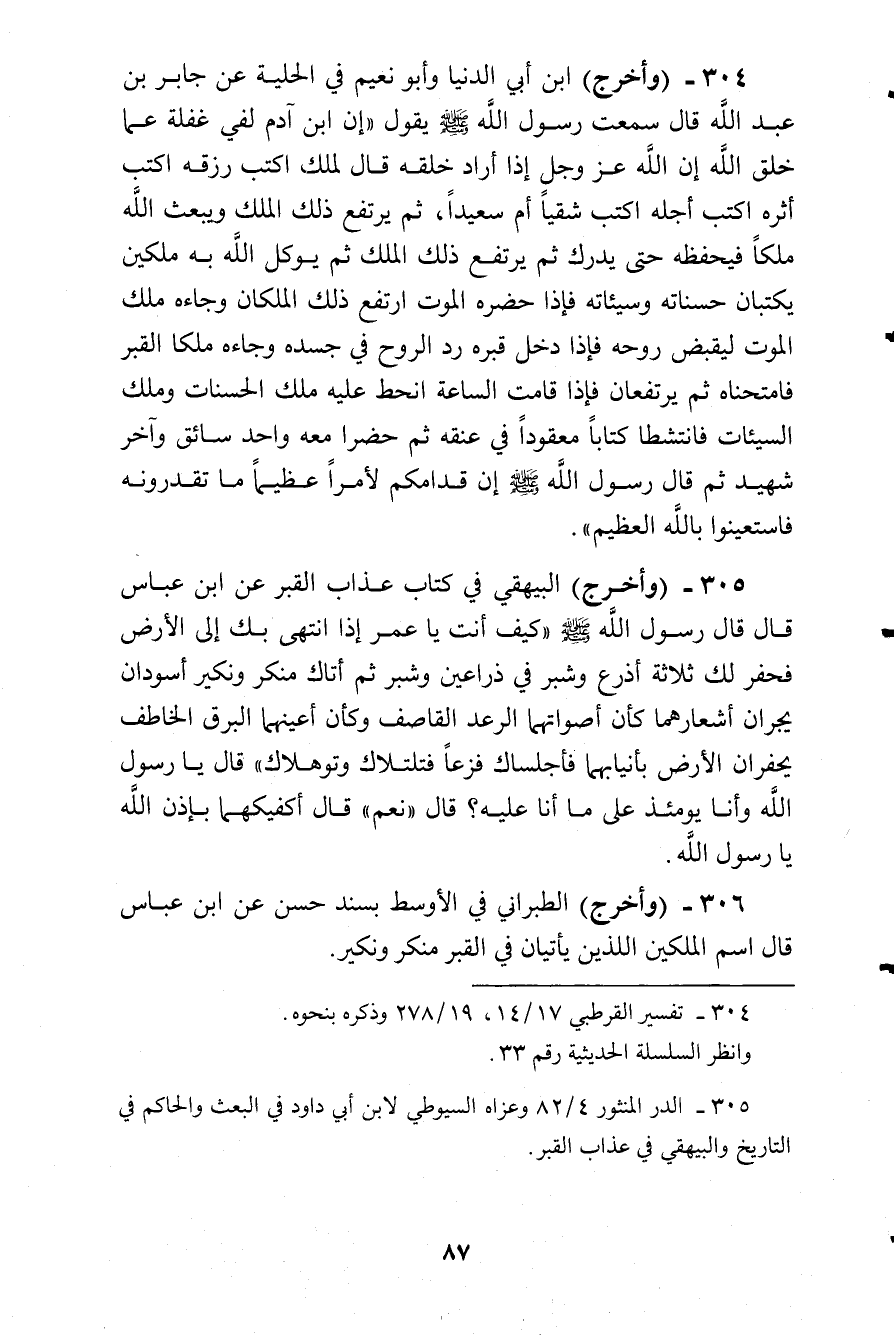 وأخرج البيهقى في كتاب عذاب القبر عن ابن عباس قال: قال رسول الله صلى الله عليه وسلم:) كيف بك يا عمر إذا انتهى بك إلى الأرض، فحفر لك ثلاثة أذرع وشبر في ذراعين وشبر، ثم أتاك منكر، ونكير، أسودان يجران أشعارهما كأن أصواتهما الرعد القاصف، وكأن أعينهما البرق الخاطف، يحفران الأرض بأنيابهما، فأجلساك فزعا، فتلتلاك وتوهلاك (قال: يا رسول الله وأنا يومئذ على ما أنا عليه؟ قال " نعم " قال: أكفيكهما بإذن الله يا رسول الله.