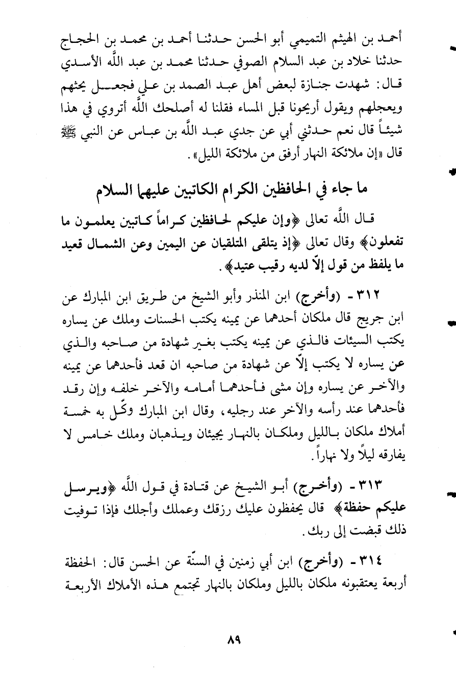 وأخرج أبو الشيخ عن قتادة في قول الله (وَيُرسِل عَلَيكُم حَفَظَة)) الأنعام: 61 (قال: يحفظون عليك رزقك، وعملك، وأجلك، فإذا توفيت ذلك قبضت إلى ربك.