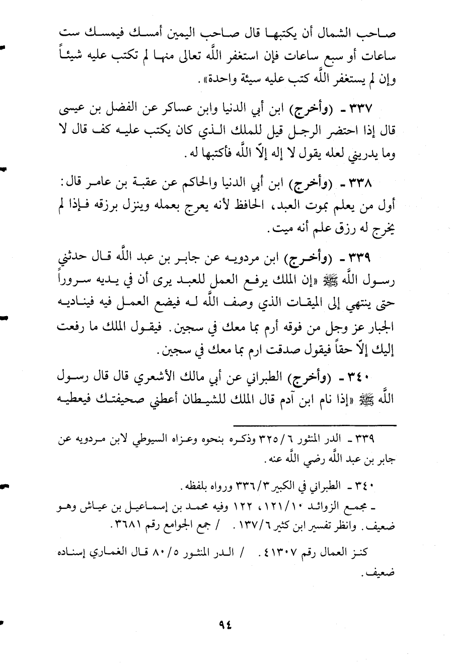 وأخرج الطبرانى عن أبى مالك الأشعرى قال: قال رسول الله صلى الله عليه وسلم: إذا نام ابن آدم قال الملك للشيطان: أعطنى صحيفتك فيعطيه