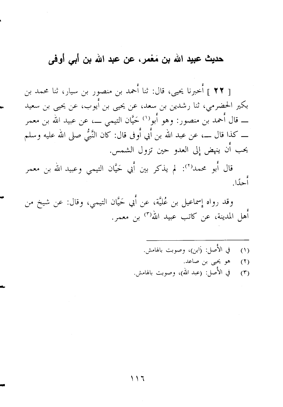 22 - أَخْبَرَنَا يَحْيَى قَالَ: ثنا أَحْمَدُ بْنُ مَنْصُورِ بْنِ سَيَّارٍ، ثنا مُحَمَّدُ بْنُ بُكَيْرٍ الْحَضْرَمِيُّ، ثنا رِشْدِينُ بْنُ سَعْدٍ، عَنْ يَحْيَى بْنِ أَيُّوبَ، عَنْ يَحْيَى بْنِ سَعِيدٍ، قَالَ أَحْمَدُ بْنُ مَنْصُورٍ: وَهُوَ أَبُو حَيَّانَ التَّيْمِيُّ، عَنْ عُبَيْدِ اللَّهِ بْنِ مَعْمَرٍ، كَذَا قَالَ عَنْ عَبْدِ اللَّهِ بْنِ أَبِي أَوْفَى، قَالَ «كَانَ النَّبِيُّ صَلَّى اللهُ عَلَيْهِ وَسَلَّمَ §يُحِبُّ أَنْ يَنْهَضَ إِلَى الْعَدُوِّ حِينَ تَزُولُ الشَّمْسُ» قَالَ أَبُو مُحَمَّدٍ: لَمْ يَذْكُرْ بَيْنَ أَبِي حَيَّانَ التَّيْمِيِّ وَعُبَيْدِ اللَّهِ بْنُ مَعْمَرٍ أَحَدًا، وَقَدْ رَوَاهُ إِسْمَاعِيلُ ابْنُ عُلَيَّةَ عَنْ أَبِي حَيَّانَ التَّيْمِيِّ وَقَالَ عَنْ شَيْخٍ مِنْ أَهْلِ الْمَدِينَةِ عَنْ كَاتَبِ عُبَيْدِ اللَّهِ بْنِ مَعْمَرٍ