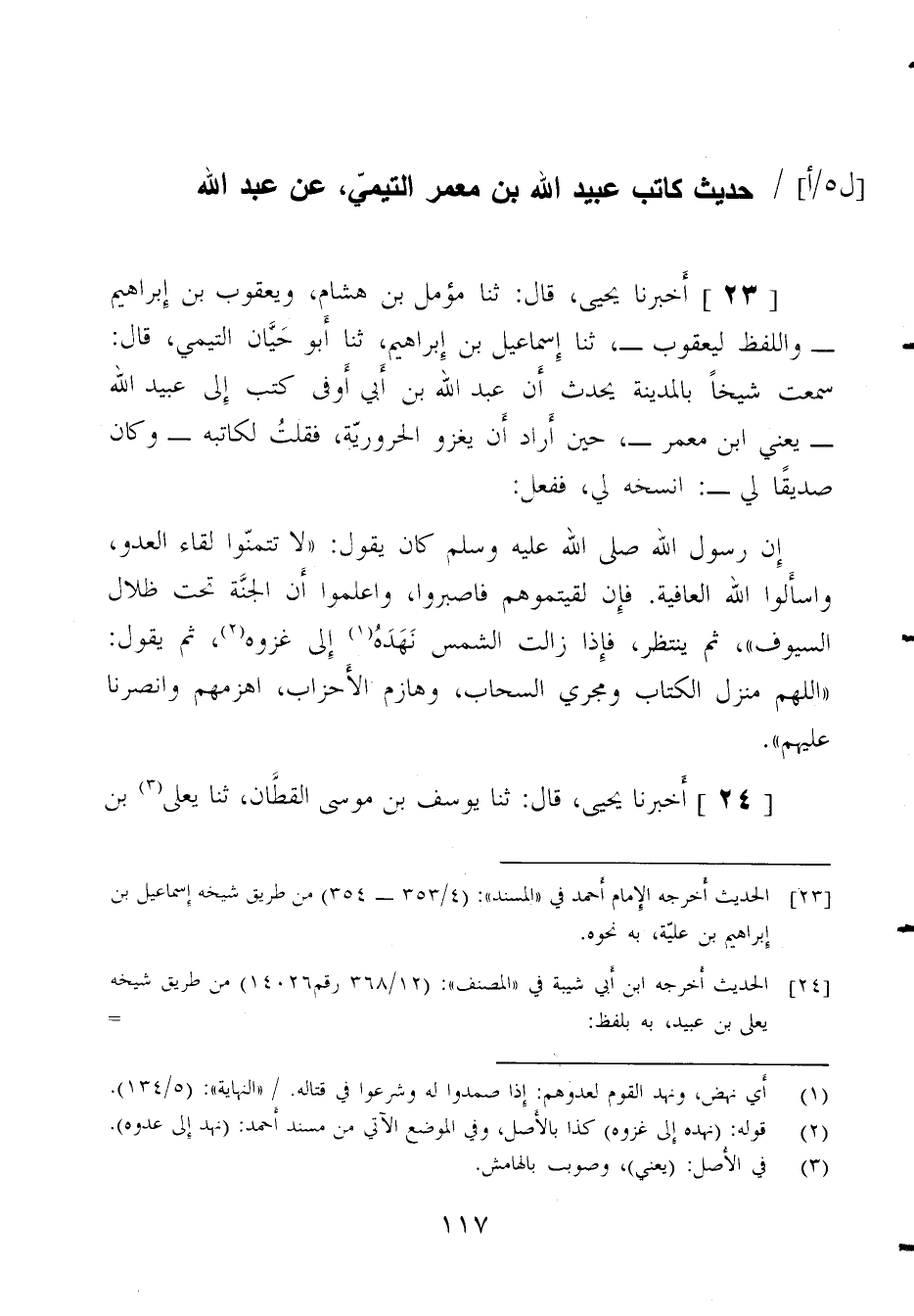 24 - أَخْبَرَنَا يَحْيَى قَالَ: ثنا يُوسُفُ بْنُ مُوسَى الْقَطَّانُ، ثنا يَعْلَى بْنُ عُبَيْدٍ، ثنا أَبُو حَيَّانَ التَّيْمِيُّ، عَنْ شَيْخٍ، مِنْ أَهْلِ الْمَدِينَةِ قَالَ كَانَ بَيْنِي وَبَيْنَ كَاتَبِ عُبَيْدِ اللَّهِ بْنِ مَعْمَرٍ مَعْرِفَةٌ وَصَدَاقَةٌ فَطَلَبْتُ إِلَيْهِ أَنْ يَنْسَخَ لِي رِسَالَةَ عَبْدِ اللَّهِ بْنِ أَبِي أَوْفَى إِلَى عُبَيْدِ اللَّهِ فَنَسَخَهَا لِي فَكَانَ فِيهَا إِنَّ عَبْدَ اللَّهِ بْنَ أَبِي أَوْفَى رَوَى لِي عَنْ رَسُولِ اللَّهِ صَلَّى اللهُ عَلَيْهِ وَسَلَّمَ أَنَّهُ قَالَ: " §لَا تَسْأَلُوا لِقَاءَ الْعَدُوِّ، وَإِنْ لَقِيتُمُوهُمْ فَاصْبِرُوا، وَاعْلَمُوا أَنَّ الْجَنَّةَ تَحْتَ ظِلَالِ السُّيُوفِ، وَيَقُولُ: اللَّهُمَّ اهْزِمْهُمْ وَانْصُرْنَا عَلَيْهِمْ " قَالَ أَبُو مُحَمَّدٍ: هَذَا يَدُلُّ عَلَى أَنَّ عُبَيْدَ اللَّهِ بْنَ مَعْمَرٍ قَدْ ذَكَرَ ذَلِكَ عَنِ ابْنِ أَبِي أَوْفَى.