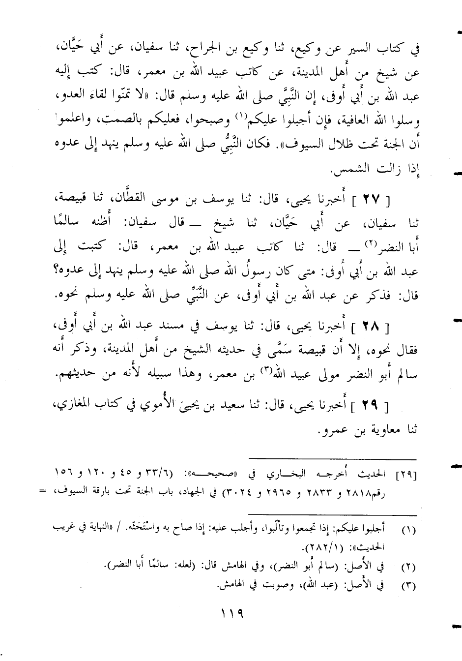 29 - أَخْبَرَنَا يَحْيَى قَالَ: ثنا سَعِيدُ بْنُ يَحْيَى الْأُمَوِيُّ، فِي كِتَابِ الْمَغَازِي ثنا مُعَاوِيَةُ بْنُ عَمْرٍو -[120]-، وَثَنَاهُ، مُحَمَّدُ بْنُ إِسْحَاقَ ثنا مُعَاوِيَةُ بْنُ عَمْرٍو، ثنا أَبُو إِسْحَاقَ الْفَزَارِيُّ، وَثنا يُوسُفُ بْنُ مُوسَى الْقَطَّانُ، ثنا عَاصِمُ بْنُ يُوسُفَ الْيَرْبُوعِيُّ، ثنا أَبُو إِسْحَاقَ الْفَزَارِيُّ، عَنْ مُوسَى بْنِ عُقْبَةَ، عَنْ سَالِمٍ أَبِي النَّضْرِ، مَوْلَى عُمَرَ بْنِ عُبَيْدِ اللَّهِ وَكَانَ كَاتِبًا لَهُ قَالَ كَتَبَ إِلَيْهِ عَبْدُ اللَّهِ بْنُ أَبِي أَوْفَى حِينَ خَرَجَ إِلَى الْحَرُورِيَّةَ فَقَرَأْتُهُ فَإِذَا فِيهِ إِنَّ رَسُولَ اللَّهِ صَلَّى اللهُ عَلَيْهِ وَسَلَّمَ فِي بَعْضِ أَيَّامِهِ الَّتِي لَقِيَ فِيهَا الْعَدُوَّ انْتَظَرَ حَتَّى مَالَتِ الشَّمْسُ، ثُمَّ قَامَ فِي النَّاسِ فَقَالَ: " أَيُّهَا النَّاسُ §لَا تَمَنَّوْا لِقَاءَ الْعَدُوِّ، وَسَلُوا اللَّهَ الْعَافِيَةَ، فَإِذَا لَقِيتُمُوهُمْ فَاصْبِرُوا، وَاعْلَمُوا أَنَّ الْجَنَّةَ تَحْتَ ظِلَالِ السُّيُوفِ، ثُمَّ قَالَ: اللَّهُمَّ مُنْزِلَ الْكِتَابِ، وَمُجْرِيَ السَّحَابِ، وَهَازِمَ الْأَحْزَابِ، اهْزِمْهُمْ وَانْصُرْنَا عَلَيْهِمْ ". هَذَا لَفْظُ حَدِيثِ مُعَاوِيَةَ بْنِ عَمْرٍو، وَقَالَ يُوسُفُ: قَالَ: كُنْتُ كَاتِبًا لِعُمَرَ بْنِ عُبَيْدِ اللَّهِ فَأَتَاهُ كِتَابُ عَبْدِ اللَّهِ بْنِ أَبِي أَوْفَى إِنَّ رَسُولَ اللَّهِ صَلَّى اللهُ عَلَيْهِ وَسَلَّمَ قَالَ: «لَا تَمَنَّوْا لِقَاءَ الْعَدُوِّ» ثُمَّ ذَكَرَ الْحَدِيثَ