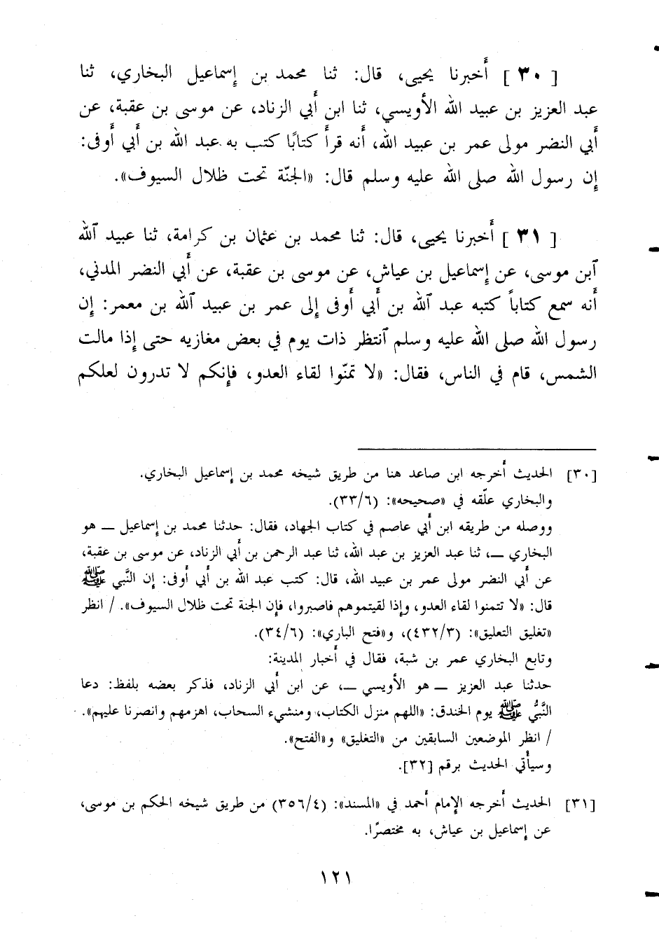 30 - أَخْبَرَنَا يَحْيَى قَالَ: ثنا مُحَمَّدُ بْنُ إِسْمَاعِيلَ الْبُخَارِيُّ، ثنا عَبْدُ الْعَزِيزِ بْنُ عُبَيْدِ اللَّهِ الْأُوَيْسِيُّ، ثنا ابْنُ أَبِي الزِّنَادِ، عَنْ مُوسَى بْنِ عُقْبَةَ، عَنْ أَبِي النَّضْرِ، مَوْلَى عُمَرَ بْنِ عُبَيْدِ اللَّهِ أَنَّهُ قَرَأَ كِتَابًا كَتَبَ بِهِ عَبْدُ اللَّهِ بْنُ أَبِي أَوْفَى: إِنَّ رَسُولَ اللَّهِ صَلَّى اللهُ عَلَيْهِ وَسَلَّمَ قَالَ: «§الْجَنَّةُ تَحْتَ ظِلَالِ السُّيُوفِ»