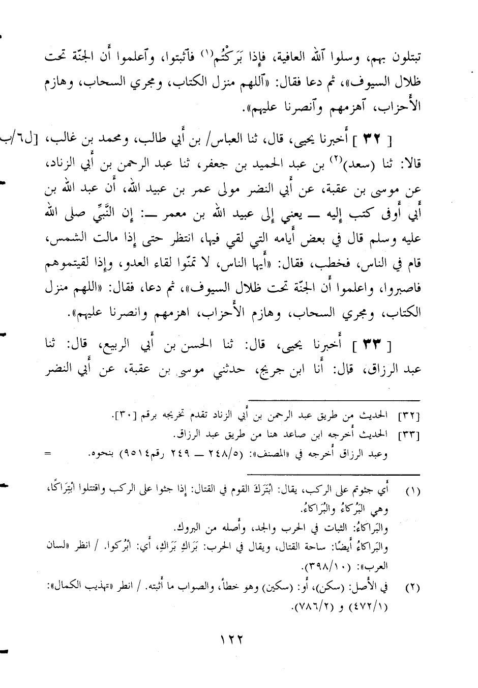 33 - أَخْبَرَنَا يَحْيَى قَالَ: ثنا الْحَسَنُ بْنُ أَبِي الرَّبِيعِ، قَالَ ثنا عَبْدُ الرَّزَّاقِ، قَالَ أنا ابْنُ جُرَيْجٍ، حَدَّثَنِي مُوسَى بْنُ عُقْبَةَ، عَنْ أَبِي النَّضْرِ -[123]- وَهُوَ سَالِمٌ، عَنْ كِتَابِ رَجُلٍ مِنْ أَسْلَمَ مِنْ أَصْحَابِ النَّبِيِّ صَلَّى اللهُ عَلَيْهِ وَسَلَّمَ يُقَالُ لَهُ عَبْدُ اللَّهِ بْنُ أَبِي أَوْفَى كَتَبَ إِلَى عُمَرَ بْنِ عُبَيْدِ اللَّهِ حِينَ سَارَ إِلَى الْحَرُورِيَّةِ يُخْبِرُهُ أَنَّ النَّبِيَّ صَلَّى اللهُ عَلَيْهِ وَسَلَّمَ فِي بَعْضِ أَيَّامِهِ الَّتِي لَقِيَ فِيهَا الْعَدُوَّ، فَكَانَ يَنْتَظِرُ حَتَّى إِذَا زَالَتِ الشَّمْسُ قَامَ فِيهِم فَقَالَ: «أَيُّهَا النَّاسُ، §لَا تَمَنَّوْا لِقَاءَ الْعَدُوِّ، وَاسْأَلُوا اللَّهَ الْعَافِيَةَ، فَإِنْ لَقِيتُمُوهُمْ فَاصْبِرُوا، وَاعْلَمُوا أَنَّ الْجَنَّةَ تَحْتَ ظِلَالِ السُّيُوفِ» ثُمَّ يَقُولُ: «اللَّهُمَّ مُنْزِلَ الْكِتَابِ، وَمُجْرِيَ السَّحَابِ، وَهَازِمَ الْأَحْزَابِ، اهْزِمْهُمْ وَانْصُرْنَا عَلَيْهِمْ»