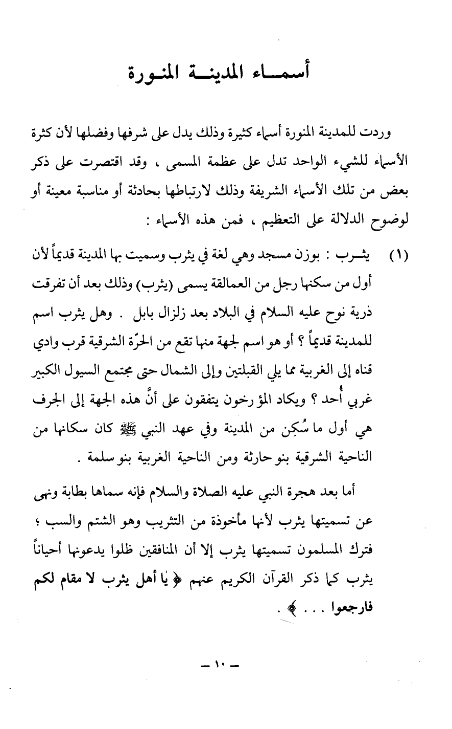 أما بعد هجرة النبي عليه الصلاة والسلام فإنه سماها بطابة ونهى عن تسميتها يثرب لأنها مأخوذة من التثريب وهو الشتم والسب، فترك المسملون تسميتها يثرب إلا أن المنافقين ظلوا يدعونها أحياناً يثرب كما ذكر القرآن الكريم عنهم (يا أهل يثرب لا مقام لكم فارجعوا ... ).