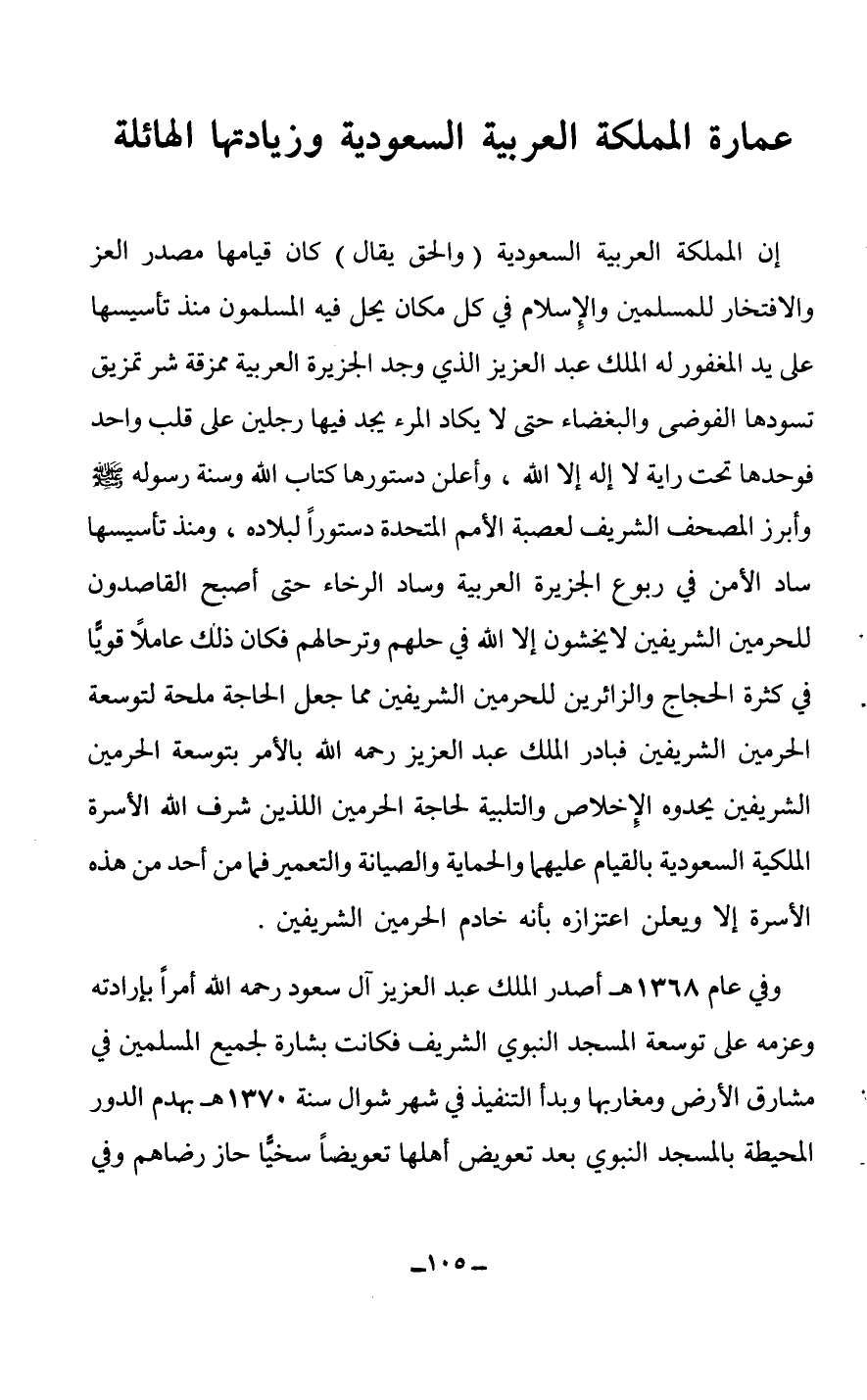إن المملكة العربية السعودية (والحق يقال) كان قيامها مصدر العز والإفتخار للمسلمين والإسلام في كل مكان يحل فيه المسلمون منذ تأسيسها على يد المغفور له الملك عبد العزيز الذي وجد الجزيرة العربية ممزقة شر تمزيق تسودها الفوضى والبغضاء حتى لا يكاد المرء يجد فيها رجلين على قلب واحد فوحدها تحت راية لا إله إلا الله، وأعلن دستورها كتاب الله وسنة رسوله صلى الله عليه وسلم وأبرز المصحف الشريف لعصبة الأمم المتحدة دستوراً لبلاده، ومنذ تأسيسها ساد الأمن في ربوع الجزيرة العربية وساد الرخاء حتى أصبح القاصدون للحرمين الشريفين لا يخشون إلا الله في حلهم وترحالهم فكان ذلك عاملاً قوياً في كثرة الحجاج والزائرين للحرمين الشريفين مما جعل الحاجة ملحة لتوسعة الحرمين الشريفين فبادر الملك عبد العزيز رحمه الله بالأمر بتوسعة الحرمين الشريفين يحدوه الإخلاص والتبية لحاجة الحرمين اللذين شرف الله الأسرة الملكية السعودية بالقيام عليهما والحماية والصيانة والتعمير فما من أحد من هذه الأسرة إلى ويعلن اعتزازه بأنه خادم الحرمين الشريفين.