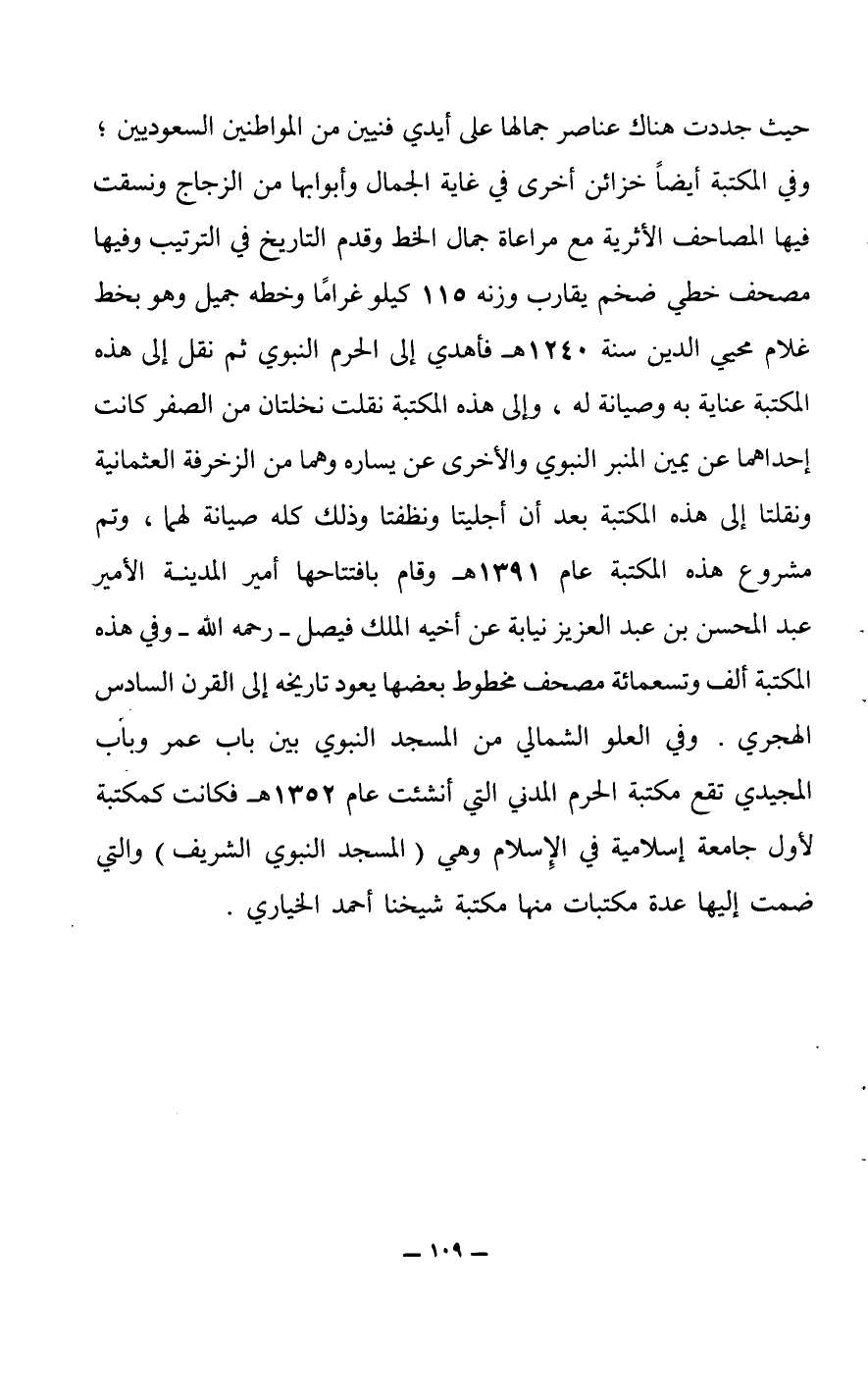 حيث جددت هناك عناصر جمالها على أيدي فنيين من المواطنين السعوديين، وفي المكتبة أيضاً خزائن أخرى في غاية الجمال وأبوابها من الزجاج ونسقت فيها المصاحف الأثرية مع مراعاة جمال الخط وقدم التاريخ في الترتيب وفيها مصحف خطي ضخم يقارب وزنه 115 كليو غراماً وخطه جميل وهو بخط غلام محيي الدين سنة 1240 هـ فأهدي إلى الحرم النبوي ثم نقل إلى هذه المكتبة عناية به وصيانة له، وإلى هذه المكتبة نقلت نخلتان من الصفر كانت إحداهما عن يمين المنبر النبوي والأخرى عن يساره وهما من الزخرفة العثمانية ونقلتا إلى هذه المكتبة بعد أن أجليتا ونظفتا وذلك كله صيانة لهما، وتم مشروع هذه المكتبة عام 1391 هـ وقام فاتتاحها أمير المدينة الأمير عبد المحسن بن عبد العزيز نيابة عن أخيه الملك فيصل - رحمه الله - وفي هذه المكتبة ألف وتسعمائة مصحف مخطوط بعضها يعود تاريخه إلى القرن السادس الهجري.