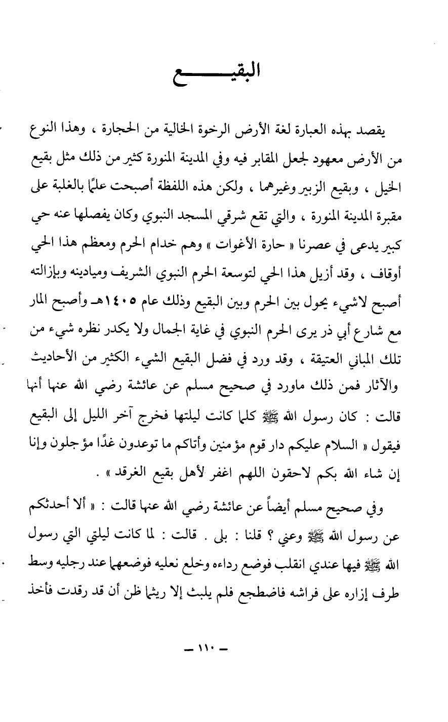 يقصد بهذه العبارة لغة الأرض الرخوة الخالية من الحجارة، وهذا النوع ن الأرض معهود لجعل المقابر فيه وفي المدينة المنورة كثير من ذلك مثل بقيع الخيل، وبقيع الزبير وغيرهما، ولكن هذه اللفظة أصبحت علماً بالغلبة على مقبرة المدينة المنورة، والتي تقع شرقي المسجد النبوي وكان يفصلها عنه حي كبير يدعى في عصرنا " حارة الأغوات " وهم خدام الحرم ومعظم هذا الحي أوقاف، وقد أزيل هذا الحي لتوسعة الحرم النبوي الشريف وميادينه وبإزالته اصبح لا شيء يحول بين الحرم وبين البقيع وذلك عام 1405 هـ وأصبح المار مع شارع أبي ذر يرى الحرم النبوي في غاية الجمال ولا يكدر نظره شيء من تلك المباني العتيقة، وقد ورد في فضل البقيع الشيء الكثير من الأحاديث والآثار فمن ذلك ما ورد في صحيح مسلم عن عائشة رضي الله عنها أنها قالت: كان رسول الله صلى الله عليه وسلم كلما كانت ليلتها فخرج آخر الليل إلى البقيع فيقول " السلام عليكم دار قوم مؤمنين وآتاكم ما توعدون غداً مؤجلون وإنا إن شاء الله بكم لاحقون اللهم اغفر لأهل بقيع الغرقد ".