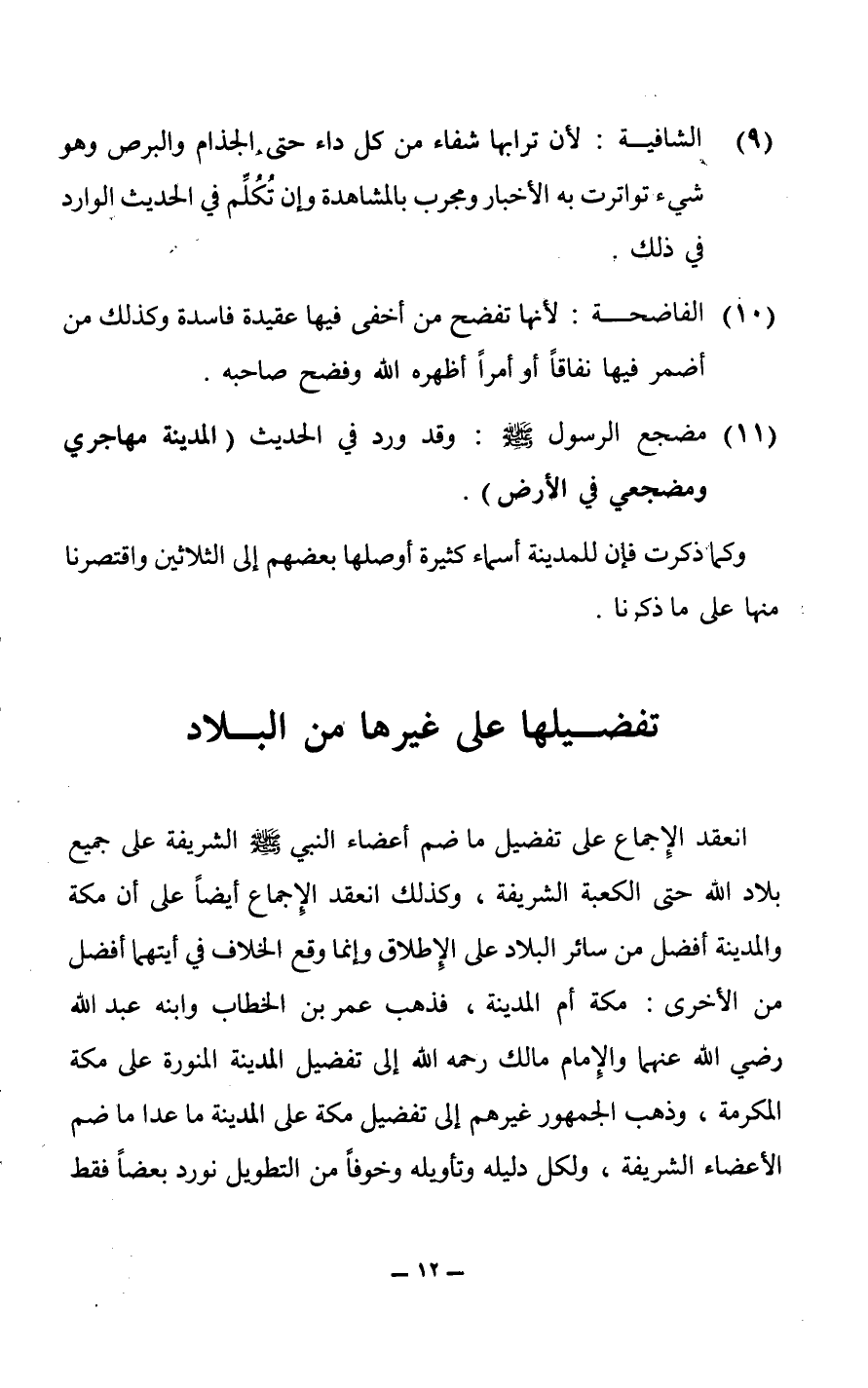 انعقد الإجماع على تفضيل ما ضم أعضاء النبي صلى الله عليه وسلم الشريفة على جميع بلاد الله حتى الكعبة الشريفة، وكذلك انعقد الإجماع أيضاً على أن مكة والمدينة أفضل من سائر البلاد على الإطلاق وإنما وقع الخلاف في أيتهما أفضل من الأخرى: مكة أم المدينة، فذهب عمر بن الخطاب وابنه عبد الله رضي الله عنهما والإمام مالك رحمه الله إلى تفضيل المدينة المنورة على مكة المكرمة، وذهب الجمهور وغيرهم إلى تفضيل مكة على المدينة ما عدا ما ضم الأعضاء الشريفة، ولكل دليله وتأويله وخوفاً من التطويل نورد بعضاً فقط…