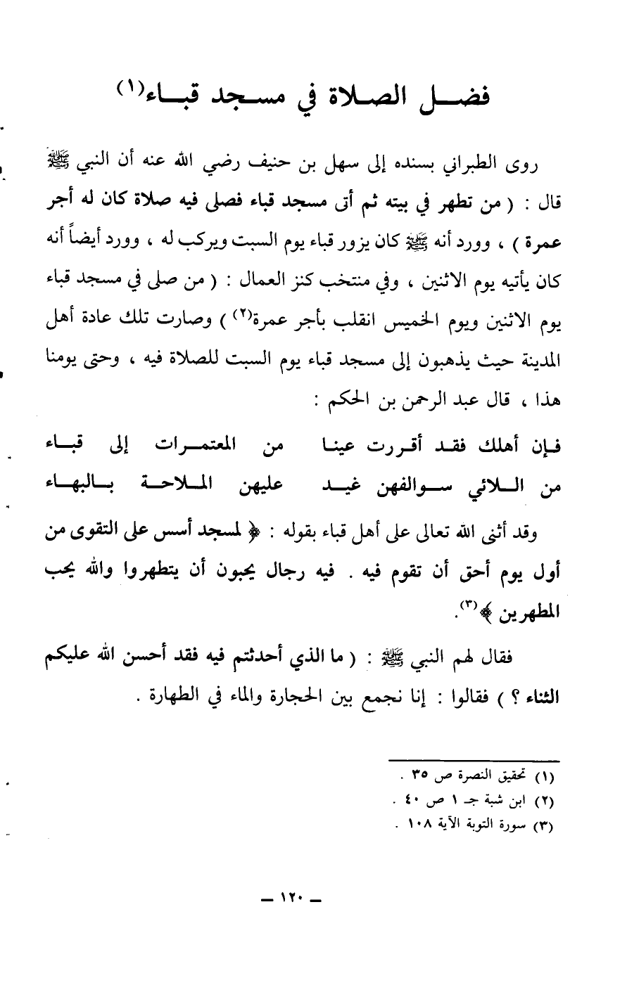 وقد أثنى الله تعالى على أهل قباء بقوله: (لمسجد أسس على التقوى من أول يوم أحق أن تقوم فيه. فيه رجال يحبون أن يتطهروا والله يحب المطهرين) (3).