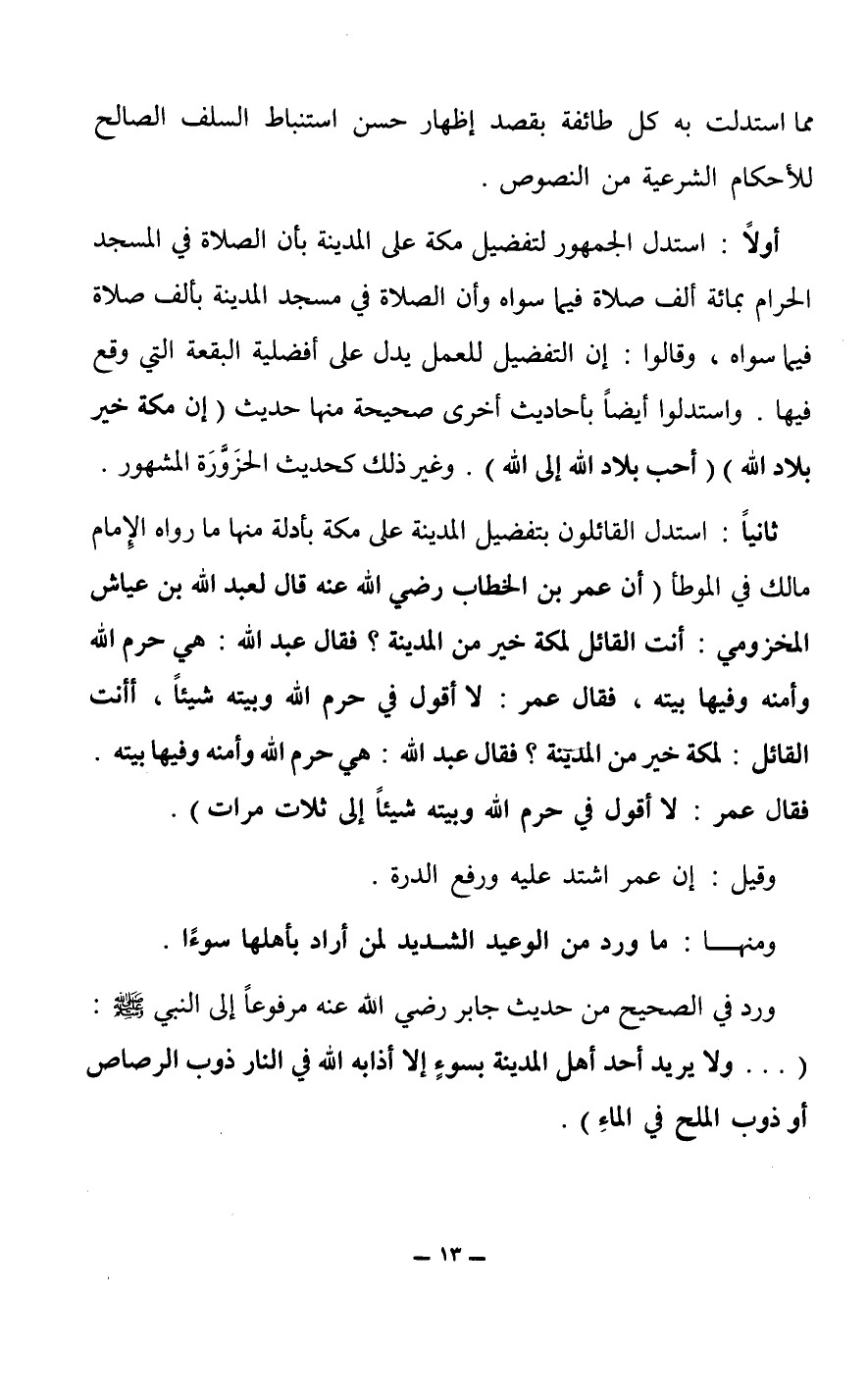 ثانياً: استدل القائلون بتفضيل المدينة على مكة بأدلة منها ما رواه الإمام مالك في الموطأ (أن عمر بن الخطاب رضي الله عنه قال لعبد الله بن عياش المخزومي: أنت القائل لمكة خير من المدينة؟ فقال عبد الله: هي حرم الله وأمنه وفيها بيته، فقال عمر: لا أقول في حرم الله وبيته شيئاً، أأنت القائل: لمكة خير من المدينة؟ فقال عبد الله: هي حرم الله وأمنه وفيها بيته.