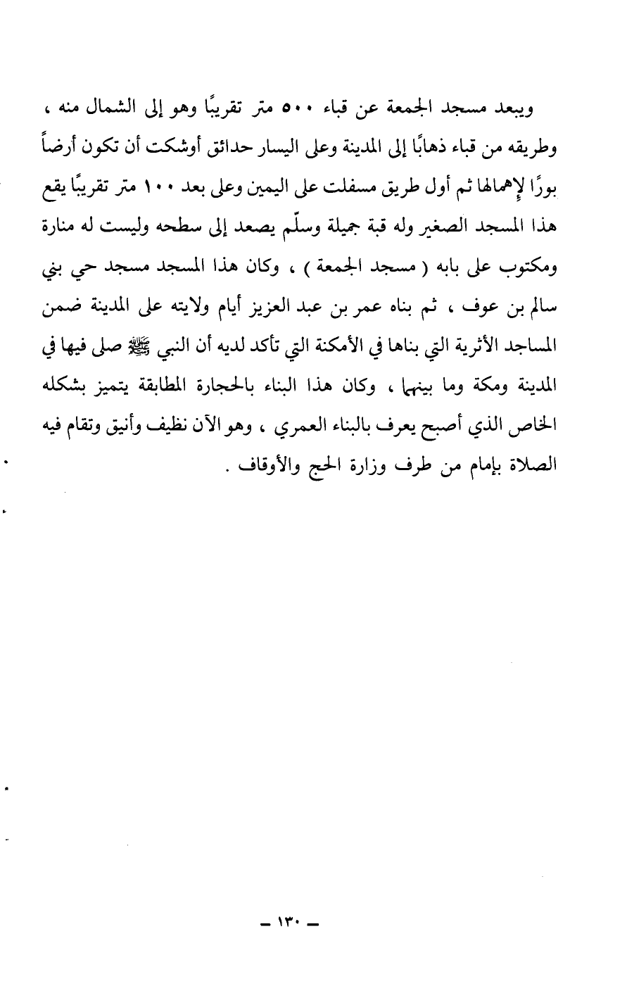 ويبعد مسجد الجمعة عن قباء 500 متر تقريباً وهو إلى الشمال منه، وطريقه من قباء ذهاباً إلى المدينة وعلى اليسار حدائق أوشكت أن تكون أرضاً بوراً لإهمالها ثم أول طريق مسفلت على اليمين وعلى بعد 100 متر تقريباً يقع هذا المسجد الصغير وله قبة جميلة وسلم يصعد إلى سطحه وليست له منارة ومكتوب على بابه (مسجد الجمعة)، وكان هذا المسجد مسجد حي بني سالم بن عوف، ثم بناه عمر بن عبد العزيز أيام ولايته على المدينة ضمن المساجد الأثرية التي بناها في الأمكنة التي تأكد لديه أن النبي صلى الله عليه وسلم صلى فيها في المدينة ومكة وما بينهما، وكان هذا البناء بالحجارة المطابقة يتميز بشكله الخاص الذي أصبح يعرف بالبناء العمري، وهو الآن نظيف وأنيق وتقام فيه الصلاة بإمام من طرف وزارة الحج والأوقاف.