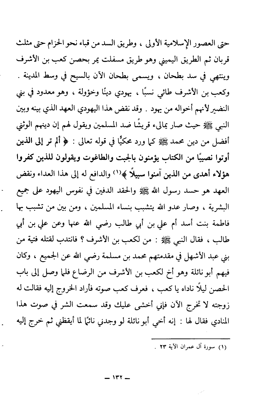 وقد نقض هذا اليهودي العهد الذي بينه وبين النبي صلى الله عليه وسلم حيث صار يمالئ قريشاً ضد المسلمين ويقول لهم إن دينهم الوثني أفضل من دين محمد صلى الله عليه وسلم كما ورد محكياً في قوله تعالى: (ألم تر إلى الذين أوتوا نصيباً من الكتاب يؤمنون بالجبت والطاغوت ويقولون للذين كفروا هؤلاء أهدى من الذين آمنوا سبيلاً) (1) والدافع له إلى هذا العداء ونقض العهد هو حسد رسول الله صلى الله عليه وسلم والحقد الدفين في نفوس اليهود على جميع البشرية، وصار عدو الله يتشبب بنساء المسلمين، ومن بين من تشبب بها فاطمة بنت أسد أم علي بن أبي طالب رضي الله عنها وعن علي بن أبي طالب، فقال النبي صلى الله عليه وسلم: من لكعب بن الأشرف؟ فانتدب لقتله فتية من بني عبد الأشهل في مقدمتهم محمد بن مسلمة رضي الله عن الجميع، وكان فيهم أبو نائلة وهو أخ لكعب بن الأشرف من الرضاع فلما وصل إلى باب الحصن ليلاً ناداه يا كعب، فعرف كعب صوته فأراد الخروج إليه فقالت له زوجته لا تخرج الآن فإني أخشى عليك وقد سمعت الشر في صوت هذا المنادي فقال لها: إنه إخي أبو نائلة لو وجدني نائماً لما أيقظني ثم خرج إليه