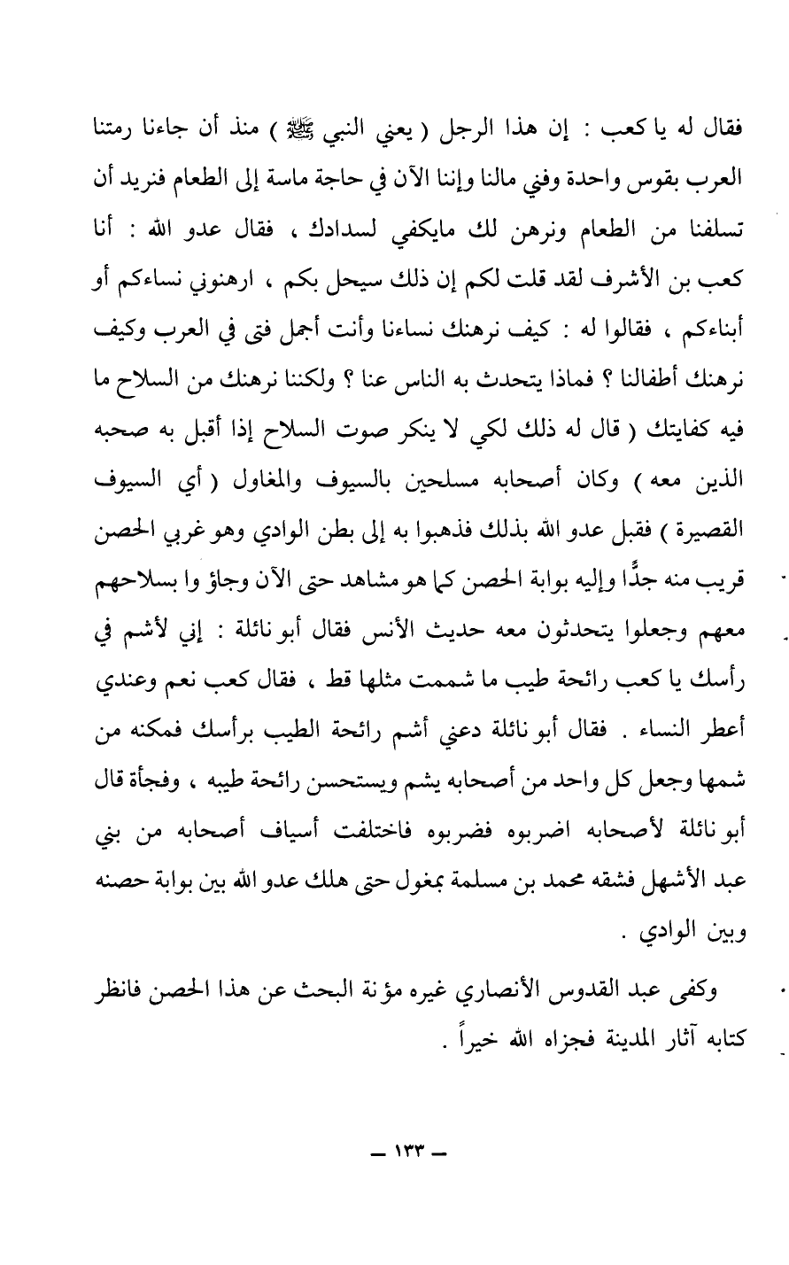 فقال له يا كعب: إن هذا الرجل (يعني النبي صلى الله عليه وسلم) منذ أن جاءنا رمتنا العرب بقوس واحدة وفني مالنا وإننا الآن في حاجة ماسة إلى الطعام فنريد أن تسلفنا من الطعام ونرهن لك ما يكفي لسدادك، فقال عدو الله: أنا كعب بن الأشرف لقد قلت لكم إن ذلك سيحل بكم، ارهنوني نساءكم أو أبناءكم، فقالوا له: كيف نرهنك نساءنا وأنت أجمل فتى في العرب وكيف نرهنك أطفالنا؟ فماذا يتحدث به الناس عنا؟ ولكننا نرهنك من السلاح ما فيه كفايتك (قال له ذلك لكي لا ينكر صوت السلاح إذا أقبل به صحبه الذين معه) وكان أصحابه مسلحين بالسيوف والمغول (أي السيوف القصيرة) فقبل عدو الله بذلك فذهبوا به إلى بطن الوادي وهو غربي الحصن قريب منه جداً وإليه بوابة الحصن كما هو مشاهد حتى الآن وجاؤوا بسلاحهم معهم وجعلوا يتحدثون معه حديث الأنس فقال أبو نائلة: إني لأشم في رأسك يا كعب رائحة طيب ما شممت مثلها قط، فقال كعب نعم وعندي أعطر النساء.