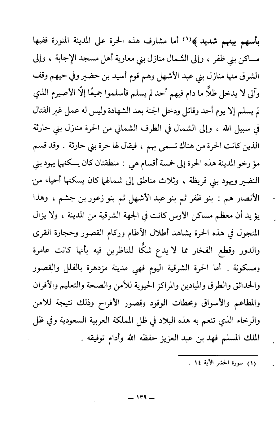 بأسهم بينهم شديد) (1) أما مشارف هذه الحرة على المدينة المنورة ففيها مساكن بني ظفر، وإلى الشمال منازل بني معاوية أهل مسجد الإجابة، وإلى الشرق منها منازل بني عبد الأشهل وهم قوم أسيد بن حضير وفي حيهم وقف وآلي لا يدخل ظلاً ما دام فيهم أحد لم يسلم فأسلموا جميعاً إلا الأصيرم الذي لم يسلم إلا يوم أحد وقاتل ودخل الجنة بعد الشهادة وليس له عمل غير القتال في سبيل الله، وإلى الشمال في الطرف الشمالي من الحرة منازل بني حارثة الذين كانت الحرة من هناك تسمى بهم، فيقال لها حرة بني حارثة. وقد قسم مؤرخو المدينة هذه الحرة إلى خمسة أقسام هي: منطقتان كان يسكنهما يهود بني النضير ويهود بني قريظة، وثلاث مناطق إلى شمالها كان يسكنها أحياء من الأنصار هم: بنو ظفر ثم بنو عبد الأشهل ثم بنو زعور بن جشم، وهذا يؤيد أن معظم مساكن الأوس كانت في الجهة الشرقية من المدينة، ولا يزال التجول في هذه الحرة يشاهد أطلال الآطام وركام القصور وحجارة القرى والدور وقطع الفخار مما لا يدع شكاً للناظرين فيه بأنها كانت عامرة ومسكونة. أما الحرة الشرقية اليوم فهي مدينة مزدهرة بالفلل والقصور والحدائق والطرق والميادين والمراكز الحيوية للأمن والصحة والتعليم والأفران والمطاعم والأسواق ومحطات الوقود وقصور الأفراح وذلك نتيجة للأمن والرخاء الذي تنعم به هذه البلاد في ظل المملكة العربية السعودية وفي ظل الملك المسلم فهد بن عبد العزيز حفظه الله وأدام توفيقه.