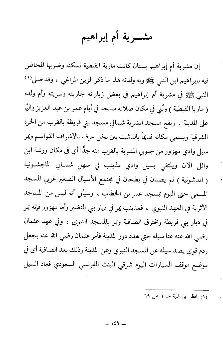 إن مشربة أم ابراهيم بستان كانت مارية القبطية تسكنه وضربها المخاض فيه بإبراهيم ابن النبي صلى الله عليه وسلم وبه ولدته هذا ما ذكر الزين المراغي، وقد صلى (1) النبي صلى الله عليه وسلم في مشربة أم إبراهيم في بعض زياراته لجاريته وسريته وأم ولده (ماريا القبطية) وبني في مكان صلاته مسجد في أيام عمر بن عبد العزيز والياً على المدينة، ويقع مسجد المشربة شمالي مسجد بني قريظة بالقرب من الحرة الشرقية ويمسى مكانه قديماً بالدشت بين نخل عرف بالأشراف القواسم ويمر سيل وادي مهزور من جنوبي المشربة بالقرب منه جداً اي في مكان ورشة ابن وائل الآن ويلتقي بسيل وادي مذينب في سهل شمالي الماجشونية (المدشونية) ثم يصبان في بطحان في مجتمع الأسيال الصغير غربي المسجد المسمى حتى اليوم بمسجد عمر بن الخطاب، وسيأتي أنه ليس من المساجد الأثرية في العهد النبوي، فمذينب يمر في ديار بني النضير وأما مهزور فإنه يمر في ديار بني قريظة ويخترق الصافية ويمر بالمسجد النبوي، وفي عهد عثمان رضي الله عنه عتا سيله حتى هدد دور المدينة فأمر عثمان رضي الله عنه بجعل ردم قوي يصد سيله عن المسجد النبوي وعن المدينة وذلك بعد الصافية أي في موضع موقف السيارات اليوم شرقي البنك الفرنسي السعودي فعاد السيل