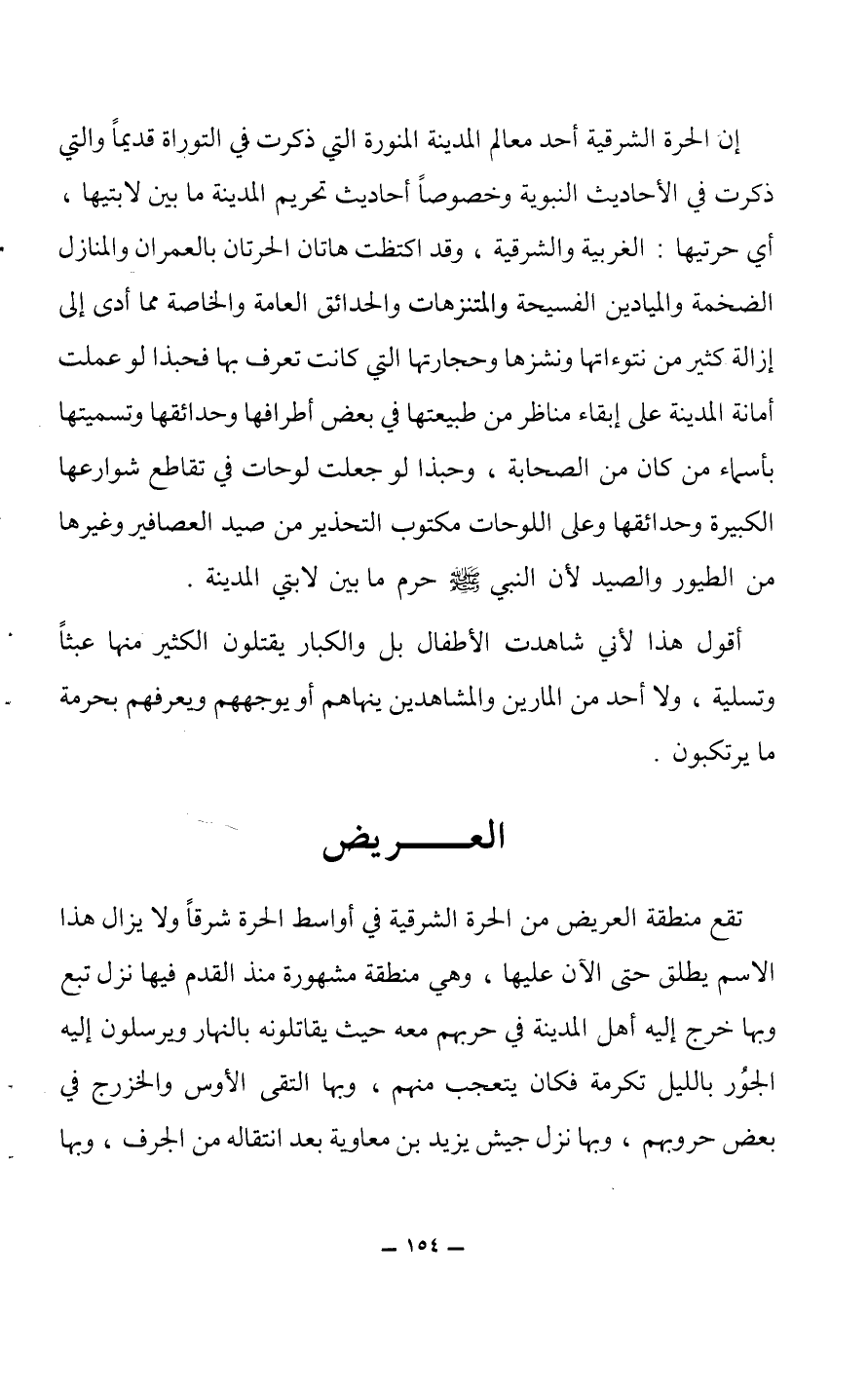 إن الحرة الشرقية أحد معالم المدينة المنورة التي ذكرت في التوراة قديماً والتي ذكرت في الأحاديث النبوية وخصوصاً أحاديث تحريم المدينة ما بين لابتيها، أي حرتيها: الغربية والشرقية، وقد اكتظت هاتان الحرتان بالعمران والمنازل الضخمة والميادين الفسيحة والمتنزهات والحدائق العامة والخاصة مما أدى إلى إزالة كثير من نتوءاتها ونشزها وحجارتها التي كانت تعرف بها فحبذا لو عملت أمانة المدينة على إبقاء مناظر من طبيعتها في بعض أطرافها وحدائقها وتسميتها بأسماء من كان من الصحابة، وحبذا لو جعلت لوحات في تقاطع شوارعها الكبيرة وحدائقها وعلى اللوحات مكتوب التحذير من صيد العصافير وغيرها من الطيور والصيد لأن النبي صلى الله عليه وسلم حرم ما بين لابتي المدينة.