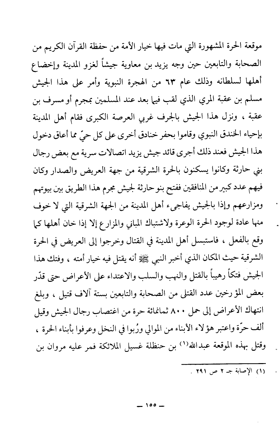 موقعة الحرة المشهورة التي مات فيها خيار الأمة من حفظة القرآن الكريم من الصحابة والتابعين حين وجه يزيد بن معاوية جيشاً لغزو المدينة وإخضاع أهلهيا لسلطاته وذلك عام 63 من الهجرة النبوية وأمر على هذا الجيش مسلم بن عقبة المري الذي لقب فيما بعد عند المسلمين بمجرم أو مسرف بن عقبة، ونزل هذا الجيش بالجرف غربي العرصة الكبرى فقام أهل المدينة بإحياء الخندق النبوي وقاموا بحفر خنادق أخرى على كل حي مما أعاق دخول هذا الجيش فعند ذلك أجرى قائد جيش يزيد اتصالات سرية مع بعض رجال بني حارثة وكانوا يسكنون بالحرة الشرقية من جهة العريض والصدار وكان فيهم عدد كبير من المنافقين ففتح بنو خارثة لجيش مجرم هذا الطريق بين بيوتهم ومزارعهم وإذا بالجيش يفاجئ أهل المدينة من الجهة الشرقية التي لا خوف منها عادة لوجود الحرة الوعرة ولاشتباك المباني والمزارع إلا إذا خان أهلها كما وقع بالفعل، فاستبسل أهل المدينة في القتال وخرجوا إلى العريض في الحرة الشرقية حيث المكان الذي أخبر النبي صلى الله عليه وسلم أنه يقتل فيه خيار أمته، وفتك هذا الجيش فتكاً رهيباً بالقتل والنهب والسلب والإعتداء على الأعراض حتى قدر بعض المؤرخين عدد القتلى من الصحابة والتابعين بستة آلاف قتيل، وبلغ انتهاك الأعراض إلى حمل 800 ثمانمائة حرة من اغتصاب رجال الجيش وقيل ألف حرة واعتبر هؤلاء الأبناء من الموالي وربوا ف يالنخل وعرفوا بأبناء الحرة، وقتل بهذه الموقعة عبد الله (1) بن حنظلة غسيل الملائكة فمر عليه مروان بن