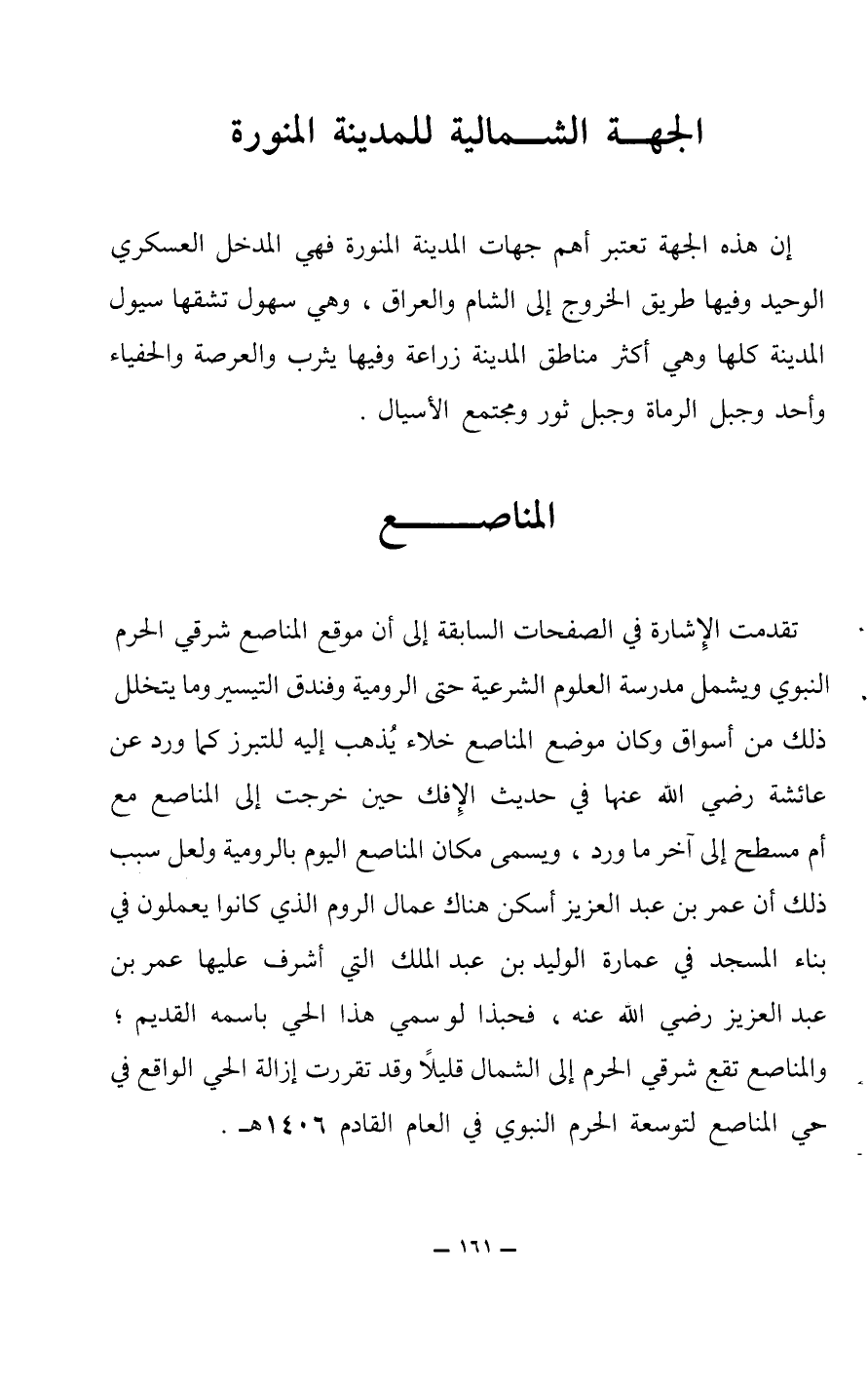 تقدمت الإشارة في الصفحات السابقة إلى أن موقع المناصع شرقي الحرم النبوي ويشمل مدرسة العلوم الشرعية حتى الرومية وفندق التيسير وما يتخلل ذلك من أسواق وكان موضع المناصع خلاء يذهب إليه للتبرز كما ورد عن عائشة رضي الله عنها في حديث الإفك حين خرجت إلى المناصع مع أم مسطح إلى آخر ما ورد، ويسمى مكان المناصع اليوم بالرومية ولعل سبب ذلك أن عمر بن عبد العزيز أسكن هناك عمال الروم الذي كانوا يعملون في بناء المسجد في عمارة الوليد بن عبد الملك التي أشرف عليها عمر بن عبد العزيز رضي الله عنه، فحبذا لو سمي هذا الحي باسمه القديم، والمناصع تقع شرقي الحرم إلى الشمال قليلاً وقد تقررت إزالة الحي الواقع في حي المناصع لتوسعة الحرم النبوي في العام القادم 1406 هـ.