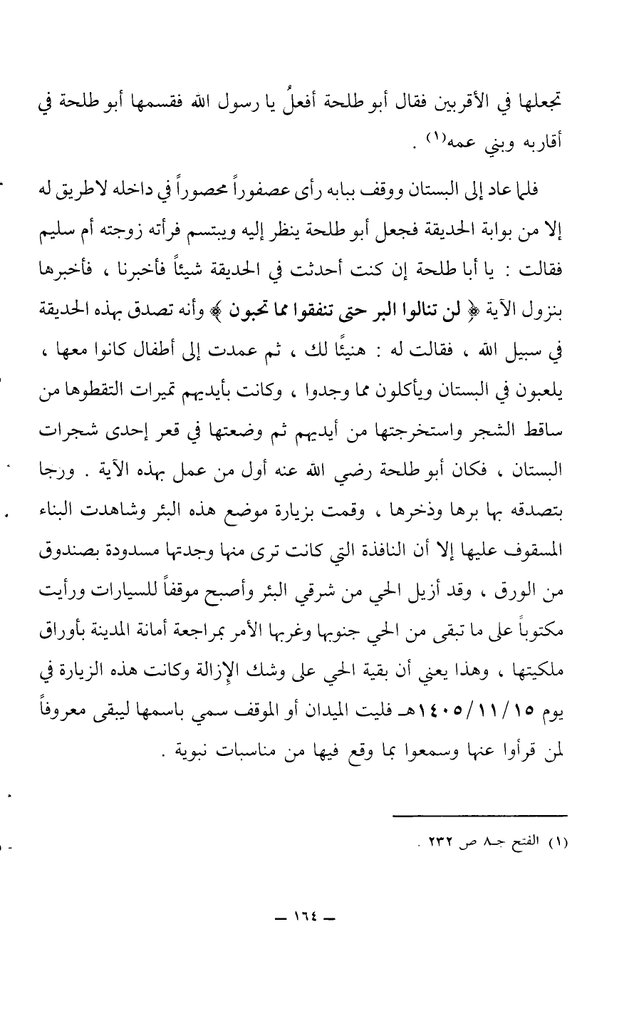 ورجا بتصدقه بها برها وذخرها، وقمت بزيارة موضع هذه البئر وشاهدت البناء المسقوف عليها إلا أن النافذة التي كانت ترى منها وجدتها مسدودة بصندوق من الورق، وقد أزيل الحي من شرقي البئر وأصبح موقفاً للسيارات ورأيت مكتوباً على ما تبقى من الحي جنوبها وغربها الأمر بمراجعة أمانة المدينة بأوراق ملكيتها، وهذا يعني أن بقية الحي على وشك الإزالة وكانت هذه الزيارة في يوم 15/ 11/1405 هـ فليت الميدان أو الموقف سمي باسمها ليبقى معروفاً لمن قرأوا عنها وسمعوا بما وقع فهيا من مناسبات نبوية.
