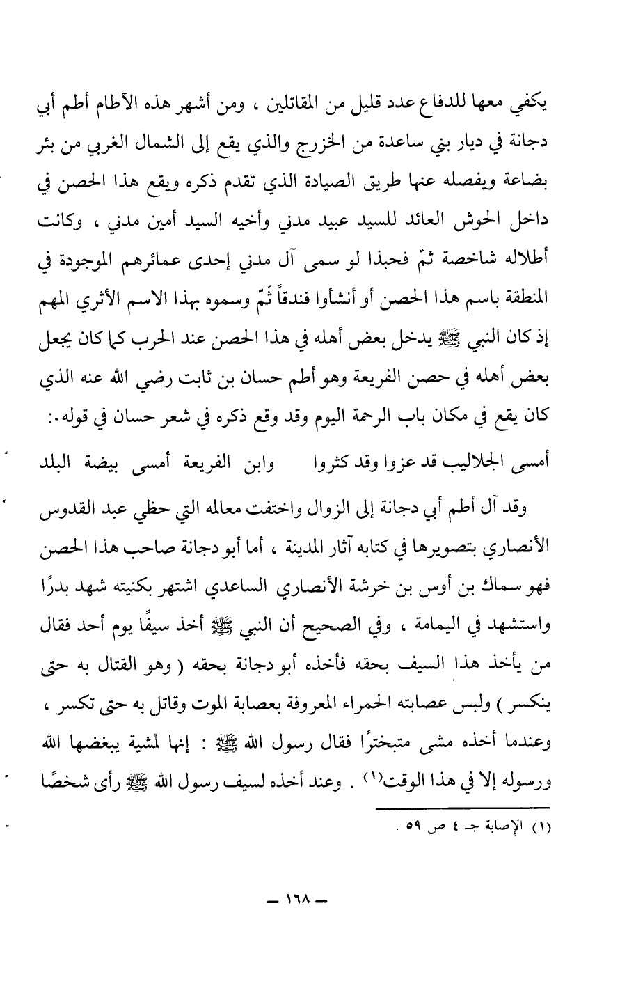 يكفي معها للدفاع عدد قليل من المقاتلين، ومن أشهر هذه الآطام أطم ابي دجانة في ديار بني ساعدة من الخزرج والذي يقع إلى الشمال الغربي من بئر بضاعة ويفصله عنها طريق الصيادة الذي تقدم ذكره ويقع هذا الحصن في داخل الحوش العائد للسيد عبيد مدني وأخيه السيد أمين مدني، وكانت أطلاله شاخصة ثم فحبذا لو سمي آل مدني إحدى عمائرهم الموجودة في المنطقة باسم هذا الحصن أو أنشأوا فندقاً ثم وسموه بهذا الإسم الأثري المهم إذ كان النبي صلى الله عليه وسلم يدخل بعض أهله في هذا الحصن عند الحرب كما كان يجعل بعض أهله في حصن الفريعة وهو أطم حسان بن ثابت رضي الله عنه الذي كان يقع في مكان باب الرحمة اليوم وقد وقع ذكره في شعر حسان في قوله: