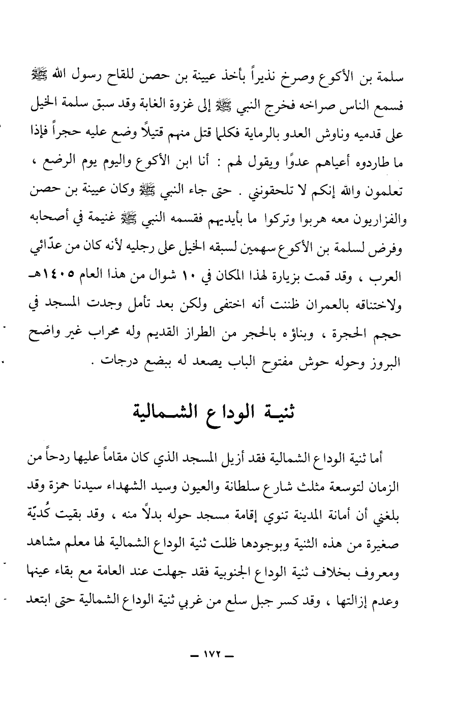 أما ثنية الوداع الشمالية فقد أزيل المسجد الذي كان مقاماً عليها ردحاً من الزمان لتوسعة مثلث شارع سلطانه والعيون وسيد الشهداء سيدنا حمزة وقد بلغني أن أمانة المدينة تنوي إقامة مسجد حوله بدلاً منه، وقد بقيت كدية صغيرة من هذه الثنية وبوجودها ظلت ثنية الوداع الشمالية لها معلم مشاهد ومعروف بخلاف ثنية الوداع الجنوبية فقد جهلت عند العامة مع بقاء عينها وعدم إزالتها، وقد كسر جبل سلع من غربي ثنية الوداع الشمالية حتى ابتعد