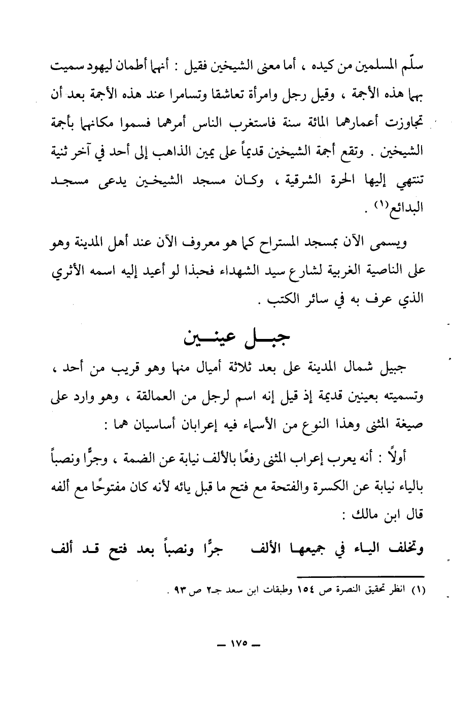 جبيل شمال المدينة على بعد ثلاثة أميال منها وهو قريب من أحد، وتسميته بعينين قديمة إذ قيل أنه اسم لرجل من العمالقة، وهو وارد على صيغة المثنى وهذا النوع من الأسماء فيه إعرابان أساسيان هما: أولاً: أنه يعرب إعراب المثنى رفعاً بالألف نيابة عن الضمة، وجراً ونصباً بالياء نيابة عن الكسرة والفتحة مع فتح ما قبل يائه لأنه كان مفتوحاً مع ألفه قال ابن مالك: