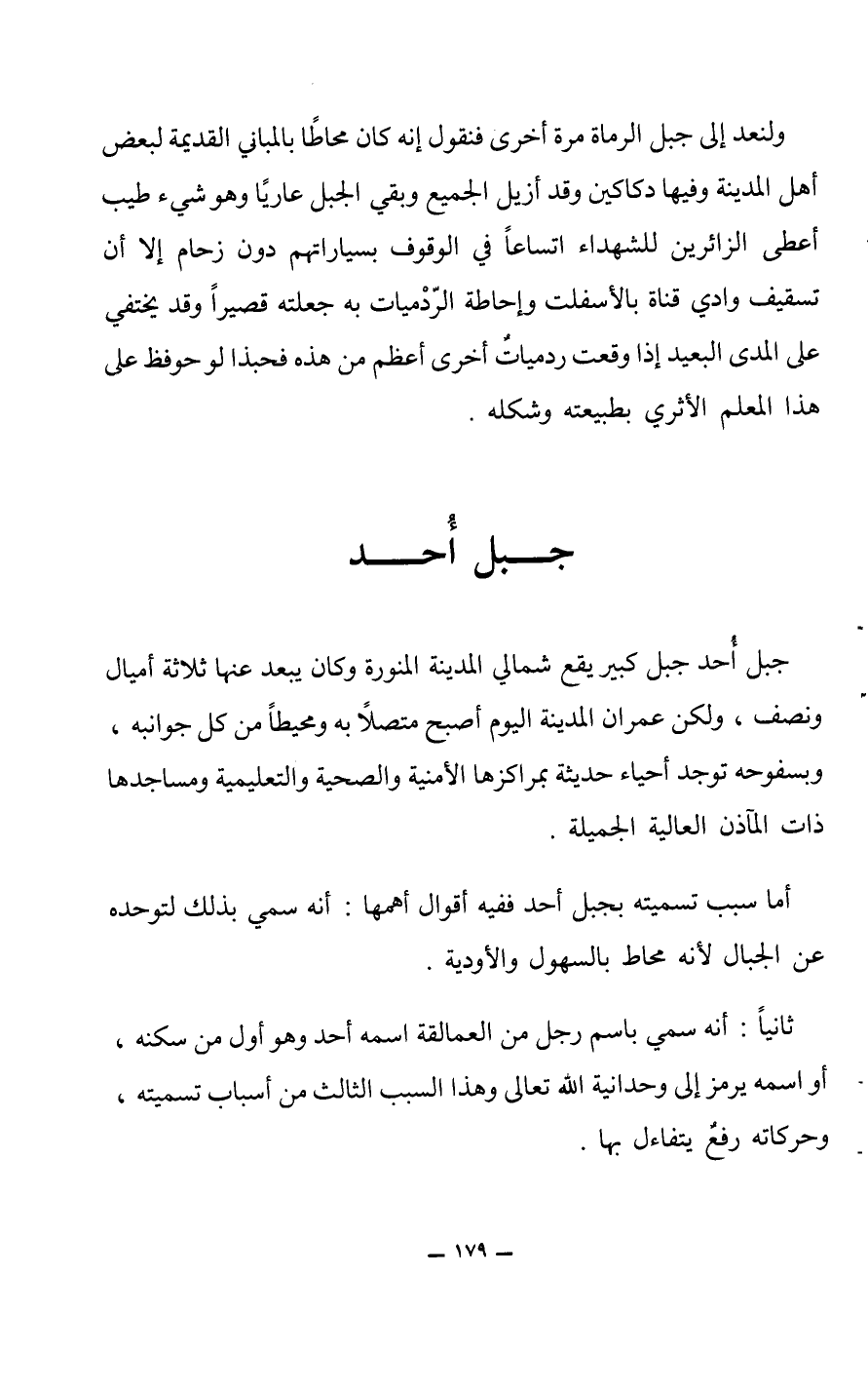 ولنعد إلى جبل الرماة مرة أخرى فنقول إنه كان محاطاً بالمباني القديمة لبعض أهل المدينة وفيها دكاكين وقد أزيل الجميع وبقي الجبل عارياً وهو شيء طيب أعطى الزائرين للشهداء اتساعاً في الوقوف بسياراتهم دون زحام إلا أن تسقيف وادي قناة بالأسفلت وإحاطة الردميات به جعلته قصيراً وقد يختفي على المدى البعيد إذا وقعت ردميات أخرى أعظم من هذه فحبذا لو حوفظ على هذا المعلم الأثري بطبيعته وشكله.