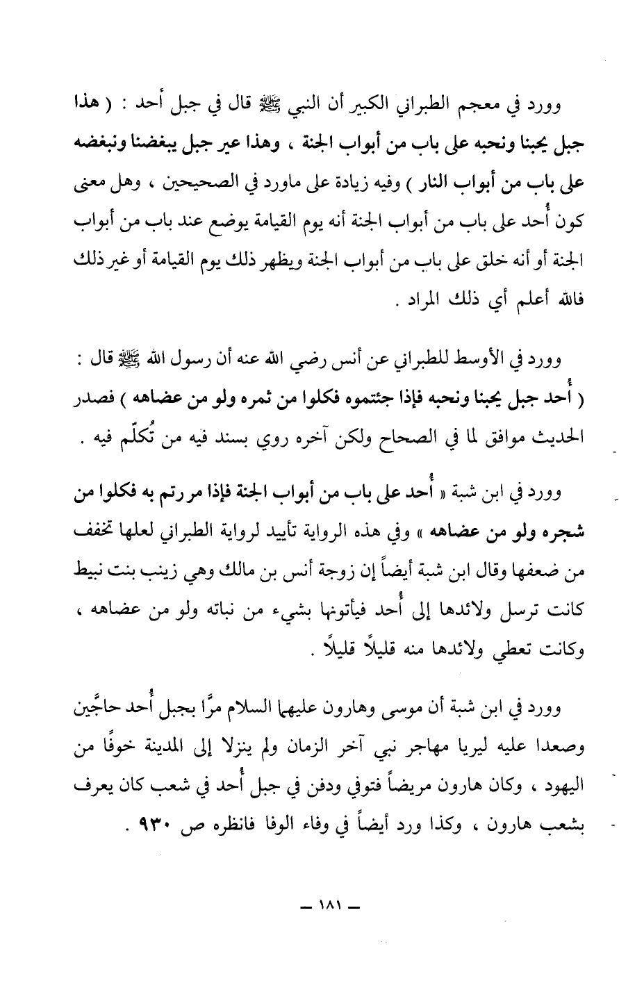 وورد في ابن شبة " أحد على باب من أبواب الجنة فإذا مر رتم به فكلوا من شجره ولو من عضهه " وفي هذه الرواية تأييد لرواية الطبراني لعلها تخفف من ضعفها وقال ابن شبة أيضاً إن زوجة أنس بن مالك وهي زينب بنت نبيط كانت ترسل ولائدها إلى أحد فيأتونها بشيء من نباته ولو من عضاهه، وكانت تعطي ولائدها منه قليلاً قليلاً.