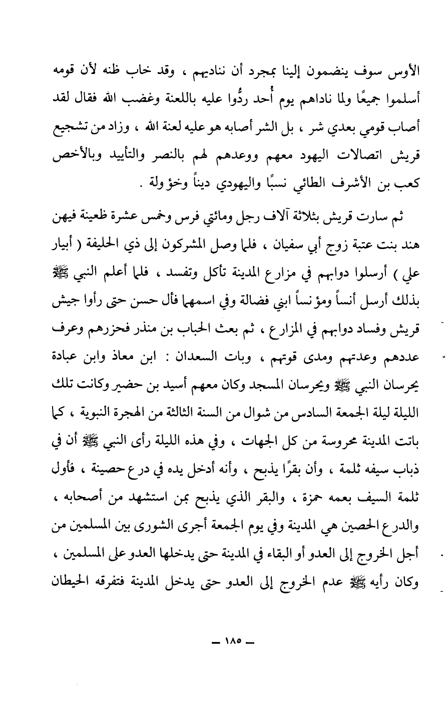 ثم سارت قريش بثلاثة آلاف رجل ومائتي فرس وخمس عشرة ظعينة فيهن هند بنت عتبة زوج أبي سفيان، فلما وصل المشركون إلى ذي الحليفة (أبيار علي) أرسلوا دوابهم في مزارع المدينة تأكل وتفسد، فلما أعلم النبي صلى الله عليه وسلم بذلك أرسل أنساً ومؤنساً ابني فضالة وفي اسمهما فأل حسن حتى رأوا جيش قريش وفساد دوابهم في المزارع، ثم بعث الحباب بن منذر فحزرهم وعرف عددهم وعدتهم ومدى قوتهم، وبات السعدان: ابن معاذ وابن عبادة يحرسان النبي صلى الله عليه وسلم ويحرسان المسجد وكان معهم أسيد بن حضير وكانت تلك الليلة ليلة الجمعة السادس من شوال من السنة الثالثة من الهجرة النبوية، كما باتت المدينة محروسة من كل الجهات، وفي هذه الليلة رأى النبي صلى الله عليه وسلم أن في ذباب سيفه ثلمة، وأن بقراً يذبح، وأنه أدخل يده في درع حصينة، فأول ثلمة السيف بعمه حمزة، والبقر الذي يذبح بمن استشهد من أصحابه، والدرع الحصين هي المدينة وفي يوم الجمعة أجرى الشورى بين المسلمين من أجل الخروج إلى العدو أو البقاء في المدينة حتى يدخلها العدو عل المسلمين، وكان رأيه صلى الله عليه وسلم عدم الخروج إلى العدو حتى يدخل المدينة فتفرقه الحيطان