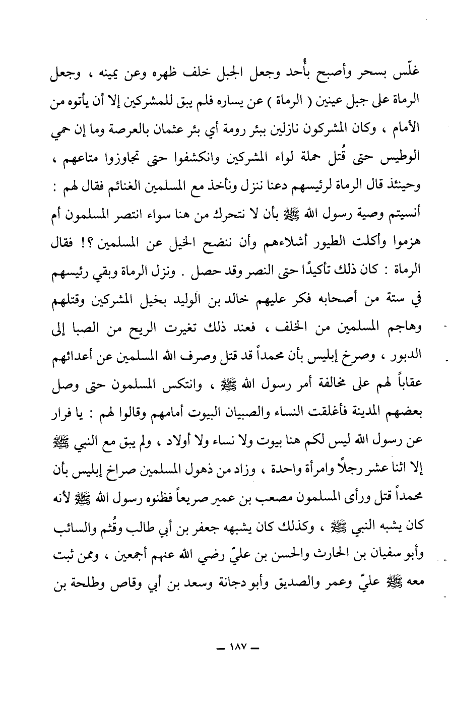 ونزل الرماة وبقي رئيسهم في ستة من أصحابه فكر عليهم خالد بن الوليد بخيل المشركين وقتلهم وهاجم المسلمين من الخلف، فعند ذلك تغيرت الريح من الصبا إلى الدبور، وصرح إبليس بأن محمداً قد قتل وصرف الله المسلمين عن أعدائهم عقاباً لهم على مخالفة أمر سول الله صلى الله عليه وسلم، وانتكس المسلمون حتى وصل بعضهم المدينة فأغلقت النساء والصبيان البيوت أمامهم وقالوا لهم: يا فرار عن رسول الله ليس لكم هنا بيوت ولا نساء ولا أولاد، ولم يبق مع النبي صلى الله عليه وسلم إلا اثناء عشر رجلاً وامرأة واحدة، وزاد من ذهول المسلمين صراخ إبليس بأن محمداً قتل ورأى المسلمون مصعب بن عمير صريعاً فظنوه رسول الله صلى الله عليه وسلم لأنه كان يشبه النبي صلى الله عليه وسلم، وكذلك كان يشبهه جعفر بن أبي طالب وقثم والسائل وأبو سفيان بن الحارث والحسن بن علي رضي الله عنهم أجمعين، وممن ثبت معه صلى الله عليه وسلم علي وعمر والصديق وأبو دجانة وسعد بن أبي وقاص وطلحة بن