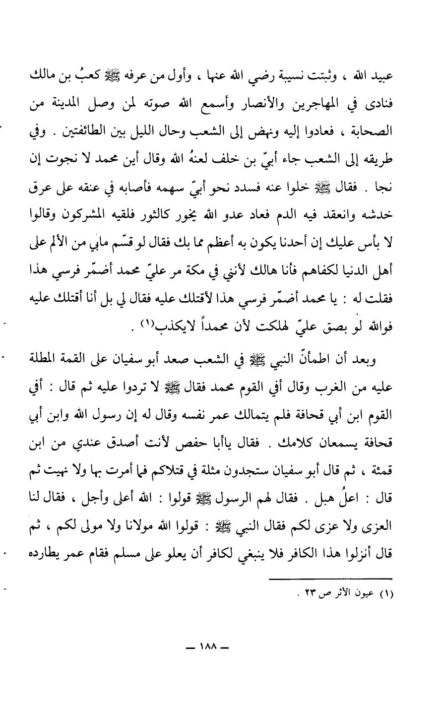 وبعد أن اطمأن النبي صلى الله عليه وسلم في الشعب صعد أبو سفيان على القمة المطلة عليه من الغرب وقال أفي القوم محمد فقال صلى الله عليه وسلم لا تردوا عليه ثم قال: أفي القوم ابن أبي قحافة فلم يتمالك عمر نفسه وقال له إن رسول الله وابن أبي قحافة يسمعان كلامك. فقال يا أبا حفص لأنت أصدق عندي من ابن قمثة، ثم قال أبو سفيان ستجدون مثلة في قتلاكم فما أمرت بها ولا نهيت ثم قال: اعل هبل. فقال لهم الرسول صلى الله عليه وسلم قولوا: الله أعلى وأجل، فقال لنا العزى ولا عزى لكم فقال النبي صلى الله عليه وسلم: قولوا الله مولانا ولا مولى لكم، ثم قال أنزلوا هذا الكافر فلا ينبغي لكافر أن يعلو على مسلم فقام عمر يطارده