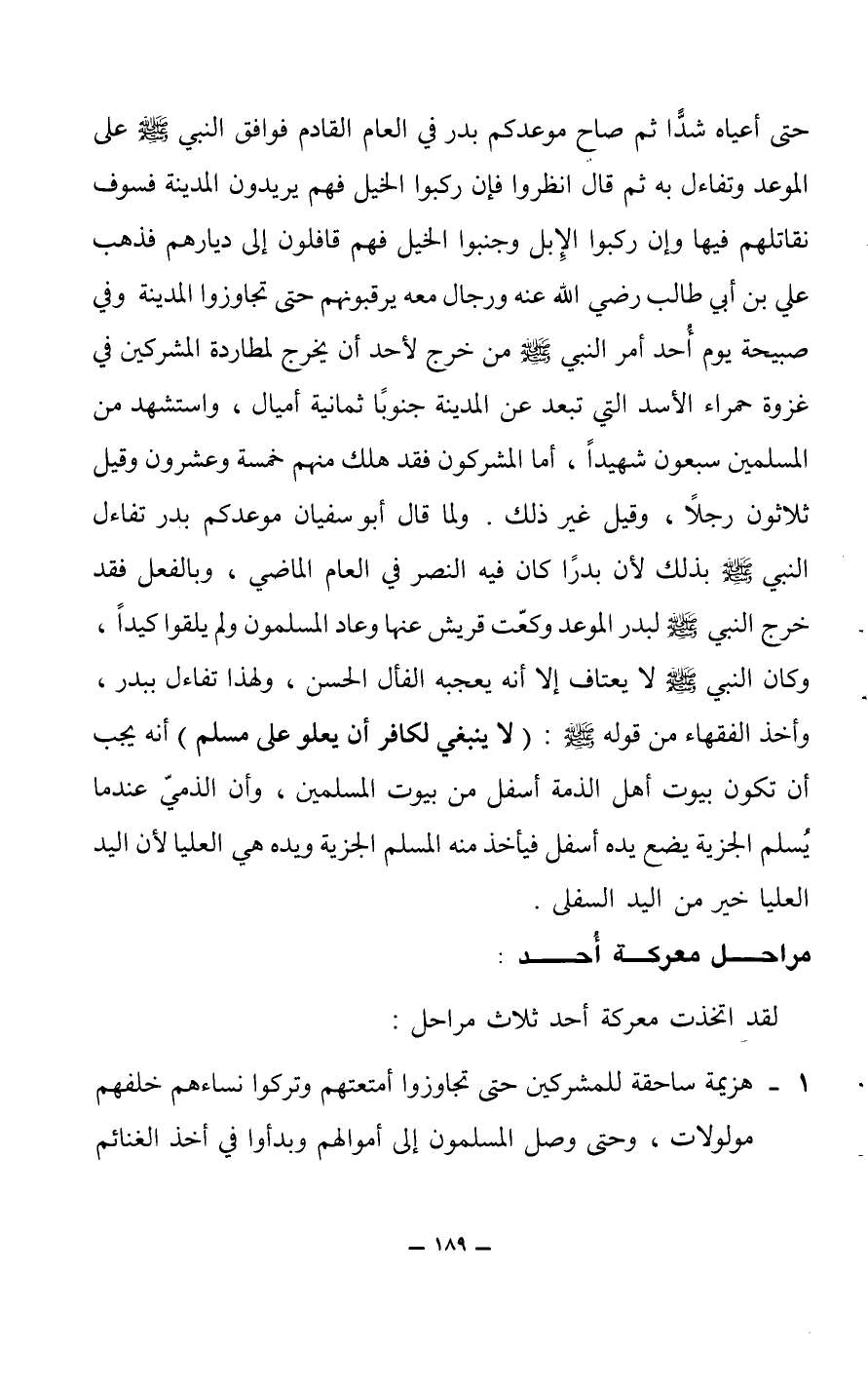 حتى أعياه شداً ثم صاح موعدكم بدر في العام القادم فوافق النبي صلى الله عليه وسلم على الموعد وتفاءله به ثم قال انظروا فإن ركبوا الخيل فهم يريدون المدينة فسوف نقاتلهم فيها وإن ركبوا الإبل وجنبوا الخيل فهم قافلون إلى ديارهم فذهب علي بن أبي طالب رضي الله عنه ورجال معه يرقبونهم حتى تجاوزوا المدينة وفي صبيحة يوم أحد أمر النبي صلى الله عليه وسلم من خرج لأحد أن يخرج لمطاردة المشركين في غزوة حمراء الأسد التي تبعد عن المدينة جنوباً ثمانية أميال، واستشهد من المسلمين سبعون شهيداً، أما المشركون فقد هلك منهم خمسة وعشرون وقيل ثلاثون رجلاً، وقيل غير ذلك.