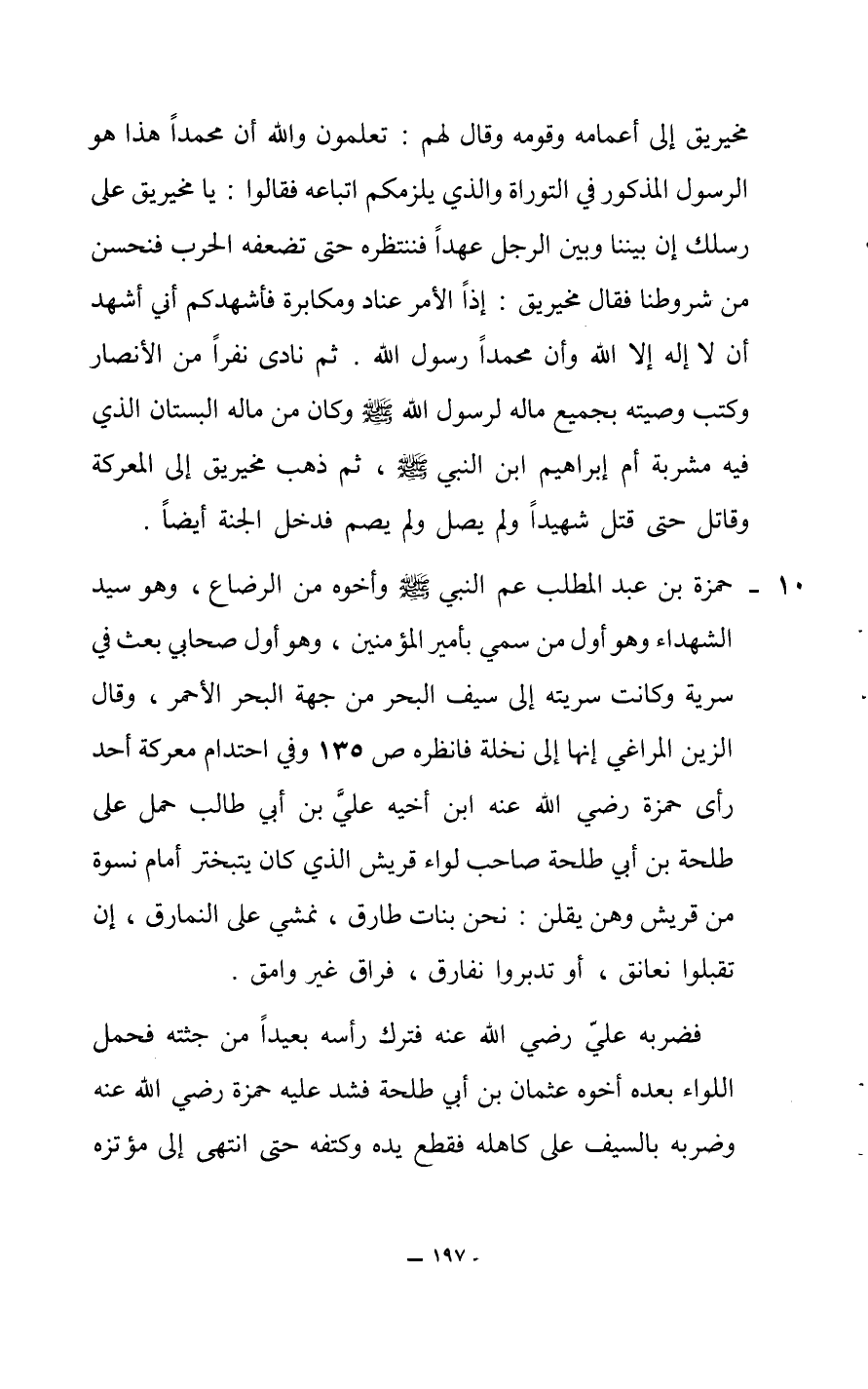 10 - حمزة بن عبد المطلب عم النبي صلى الله عليه وسلم وأخوه من الرضاع، وهو سيد الشهداء وهو أول من سمي بأمير المؤمنين، وهو أول صحابي بعث في سرية وكانت سريته إلى سيف البحر من جهة البحر الأحمر، وقال الزين المراغي إنها إلى نخلة فانظره ص 135 وفي احتدام معركة أحد رأى حمزة رضي الله عنه ابن أخيه علي بن ابي طالب حمل على طلحة بن أبي طلحة صاحب لواء قريش الذي كان يتبختر أمام نسوة من قريش وهن يقلن: نحن بنات طارق، نمشي على النمارق، إن تقبلوا نعانق، أو تدبروا نفارق، فراق غير وامق.