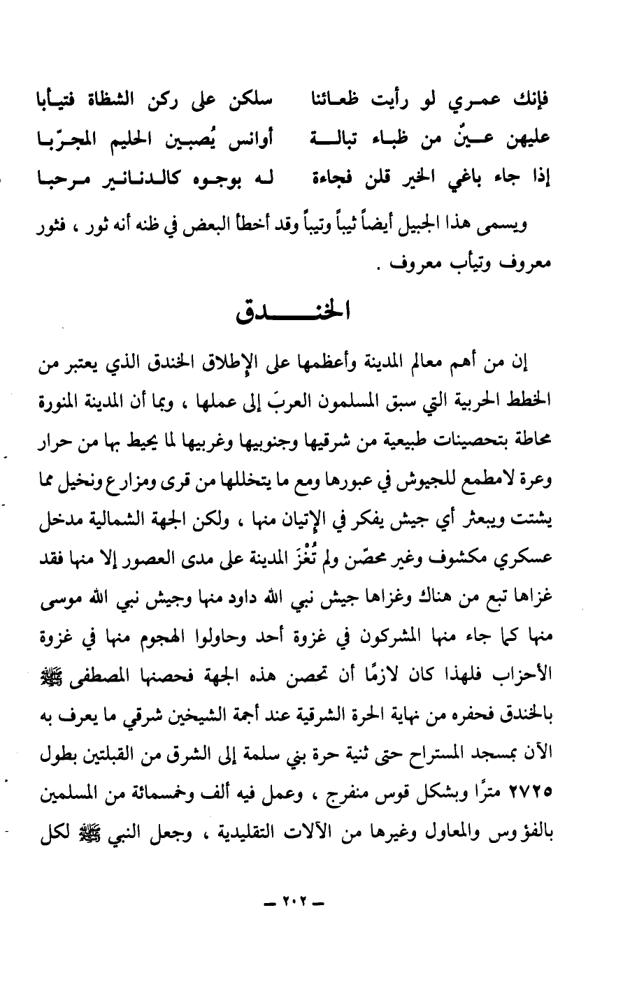 إن من أهم معالم المدينة وأعظمها على الإطلاق الخندق الذي يعتبر من الخطط الحربية التي سبق المسلمون العرب إلى عملها، وبما أن المدينة المنورة محاطة بتحصينات طبيعية من شرقيها وجنوبيها وغربيها لما يحيط بها من حرار وعرة لا مطمع للجيوش في عبورها ومع ما يتخللها من قرى ومزارع ونخيل مما يشتت ويبعثر اي جيش يفكر في الإتيان منها، ولكن الجهة الشمالية مدخل عسكري مكشوف وغير محصن ولم تغز المدينة على مدى العصور إلا منها فقد غزاها تبع من هناك وغزاها جيش نبي الله داود منها وجيش نبي الله موسى منها كما جاء منها المشركون في غزوة أحد وحاولوا الهجوم منها في غزوة الأحزاب فلهذا كان لازماً أن تحصن هذه الجهة فحصنها المصطفى صلى الله عليه وسلم بالخندق فحفره من نهاية الحرة الشرقية عند أجمة الشيخين شرقي ما يعرف به الآن بمسجد المستراح حتى ثنية حرة بني سلمة إلى الشرق من القبلتين بطول 2725 متراً وبشكل قوس منفرج، وعمل فيه الف وخمسمائة من المسلمين بالفؤوس والمعاول وغيرها من الآلات التقليدية، وجعل النبي صلى الله عليه وسلم لكل