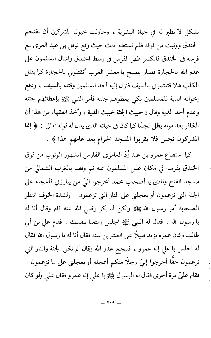 بشكل لا نظير له في حياة البشرية، وحاولت خيول المشركين أن تقتحم الخندق ووثبت من فوقه فلم تستطع ذلك حيث وقع نوفل بن عبد العزى مع فرسه في الخندق فانكسر ظهر الفرس في وسط الخندق وانهال المسلمون على عدو الله بالحجارة فصار يصيح يا معشر العرب أتقتلوني بالحجارة كما يقتل الكلب هلا قتلتموني بالسيف فنزل إليه أحد المسلمين وقتله بالسيف، ودفع إخوانه الدية للمسلمين لكي يعطوهم جثته فأمر النبي صلى الله عليه وسلم بإعطائهم جثته وعدم أخذ الدية وقال " خبيث الجثة خبيث الدية " وأخذ الفقهاء من هذا أن الكافر بعد موته يظل نجساً كما كان في حياته الذي يدل له قوله تعالى: (إنما المشركون نجس فلا يقربوا المسجد الحرام بعد عامهم هذا).