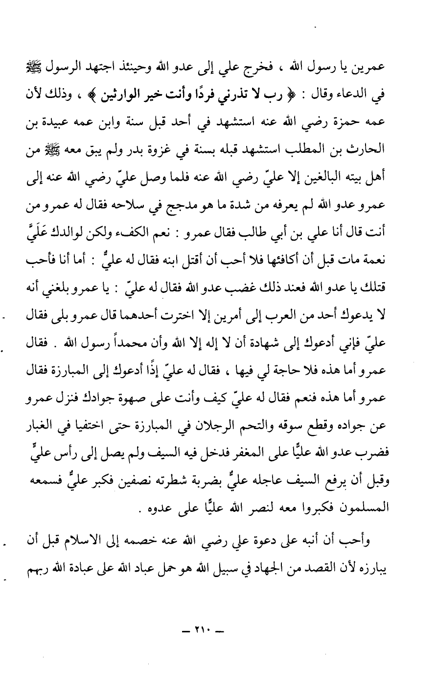 عمرين يا رسول الله، فخرج علي إلى عدو الله وحينئذ اجتهد الرسول صلى الله عليه وسلم في الدعاء وقال: (رب لا تذرني فرداً وأنت خير الوارثين)، وذلك لأن عمه حمزة رضي الله عنه استشهد في أحد قبل سنة وابن عمه عبيدة بن الحارث بن المطلب استشهد قبله بسنة في غزوة بدر ولم يبق معه صلى الله عليه وسلم من أهل بيته البالغين إلا علي رضي الله عنه فلما وصل علي رضي الله عنه إلى عمرو عدو الله لم يعرفه من شدة ما هو مدجج في سلاحه فقال له عمرو من أنت قال أنا علي بن أبي طالب فقال عمرو: نعم الكفء ولكن لوالدك عليً نعمة مات قبل أن أكافئها فلا أحب أن أقتل ابنه فقال له عليٌ: أما أنا فأحب قتلك يا عدو الله فعند ذلك غضب عدو الله فقال له علي: يا عمرو بلغني أنه لا يدعوك أحد من العرب إلى أمرين إلا اخترت أحدهما قال عمرو بلى فقال علي فإني أدعوك إلى شهادة أن لا إله إلا الله وأن محمداً رسول الله.