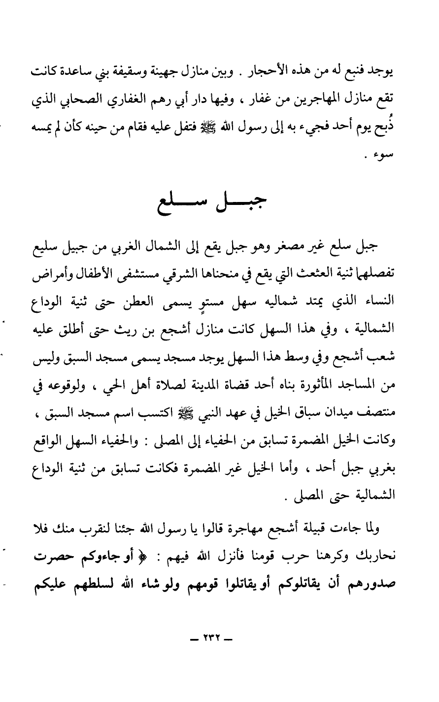 جبل سلع غير مصغر وهو جبل يقع إلى الشمال الغربي من جبيل سليع تفصلهما ثنية العثعث التي يقع في منحناها الشرقي مستشفى الأطفال وأمراض النساء الذي يمتد شماليه سهل مستوٍ يسمى العطن حتى ثنية الوداع الشمالية، وفي هذا السهل كانت منازل أشجع بن ريث حتى أطلق عليه شعب أشجع وفي وسط هذا السهل يوجد مسجد يسمى مسجد السبق وليس من المساجد المأثورة بناه أحد قضاة المدينة لصلاة أهل الحي، ولوقوعه في منتصف ميدان سباق الخيل في عهد النبي صلى الله عليه وسلم اكتسب اسم مسجد السبق، وكانت الخيل المضمرة تسابق من الحفياء إلى المصلى: والحفياء السهل الواقع بغربي جبل أحد، وأما الخيل غير المضمرة فكانت تسابق من ثنية الوداع الشمالية حتى المصلى.