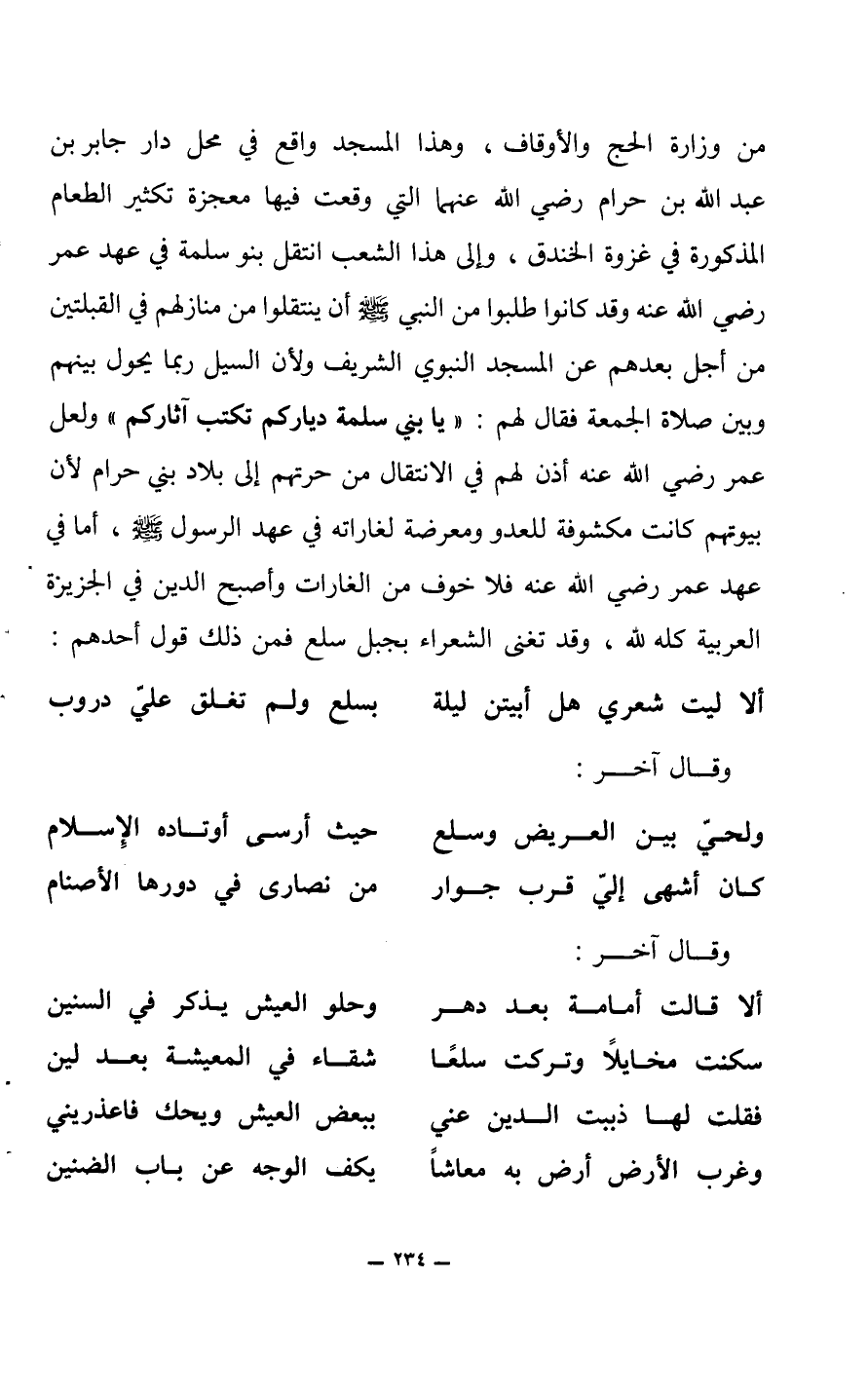 من وزارة الحج والأوقاف، وهذا المسجد واقع في محل دار جابر بن عبد الله بن حرام رضي الله عنهما التي وقعت فيها معجزة تكثير الطعام المذكورة في غزوة الخندق، وإلى هذا الشعب انتقل بنو سلمة في عهد عمر رضي الله عنه وقد كانوا طلبوا من النبي صلى الله عليه وسلم أن ينتقلوا من منازلهم في القبلتين من أجل بعدهم عن المسجد النبوي الشريف ولأن السيل ربما يحول بينهم وبين صلاة الجمعة فقال لهم: " يا بني سلمة دياركم تكتب آثاركم " ولعل عمر رضي الله عنه أذن لهم في الانتقال من حرتهم إلى بلاد بني حرام لأن بيوتهم كانت مكشوفة للعدو ومعرضة لغاراته في عهد الرسول صلى الله عليه وسلم، أما في عهد عمر رضي الله عنه فلا خوف من الغارات وأصبح الدين في الجزيرة العربية كله لله، وقد تغنى الشعراء بجبل سلع فمن ذلك قول أحدهم: