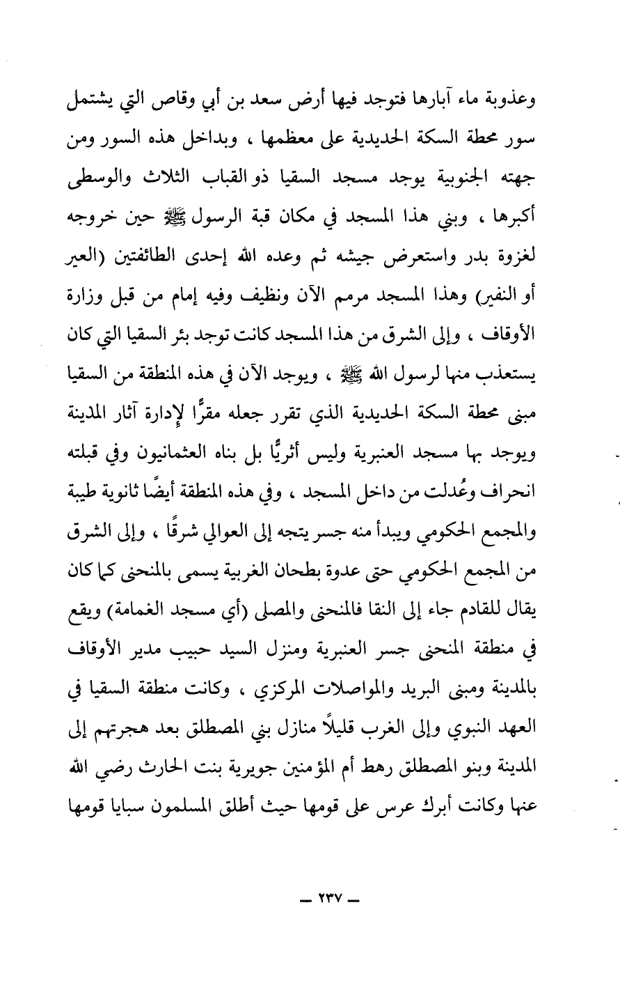 وعذوبة ماء آبارها فتوجد فيها أرض سعد بن أبي وقاص التي يشتمل سور محطة السكة الحديدية على معظمها، وبداخل هذه السور ومن جهته الجنوبية يوجد مسجد السقيا ذو القباب الثلاث والوسطى أكبرها، وبني هذا المسجد في مكان قبة الرسول صلى الله عليه وسلم حين خروجه لغزوة بدر واستعرض جيشه ثم وعده الله إحدى الطائفتين (العير أوالنفير) وهذا المسجد مرمم الآن ونظيف وفيه إمام من قبل وزارة الأوقاف، وإلى الشرق من هذا المسجد كانت توجد بئر السقيا التي كان يستعذب منها لرسول الله صلى الله عليه وسلم، ويوجد الآن في هذه المنطقة من السقيا مبني محطة السكة الحديدية الذي تقرر جعله مقراً لإدارة آثار المدينة ويوجد بها مسجد العنبرية وليس أثرياً بل بناه العثمانيون وفي قبلته انحراف وعدلت من داخل المسجد، وفي هذه المنطقة أيضاً ثانوية طيبة والمجمع الحكومي ويبدأ منه جسر يتجه إلى العوالي شرقاً، و وإلى الشرق منالمجمع الحكومي حتى عدوة بطحان الغربية يسمى بالمنحنى كما كان يقال للقادم جاء إلى النقا فالمنحنى والمصلى (أي مسجد الغمامة) ويقع في منطقة المنحنى جسر العنبرية ومنزل السيد حبيب مدير الأوقاف بالمدينة ومبنى البريد والمواصلات المركزي، وكانت منطقة السقيا في العهد النبوي وإلى الغرب قليلاً منازل بني المصطلق بعد هجرتهم إلى المدينة وبنو المصطلق رهط أم المؤمنين جويرية بنت الحارث رضي الله عنها وكانت أبرك عرس على قومها حيث أطلق المسلمون سبايا قومها…