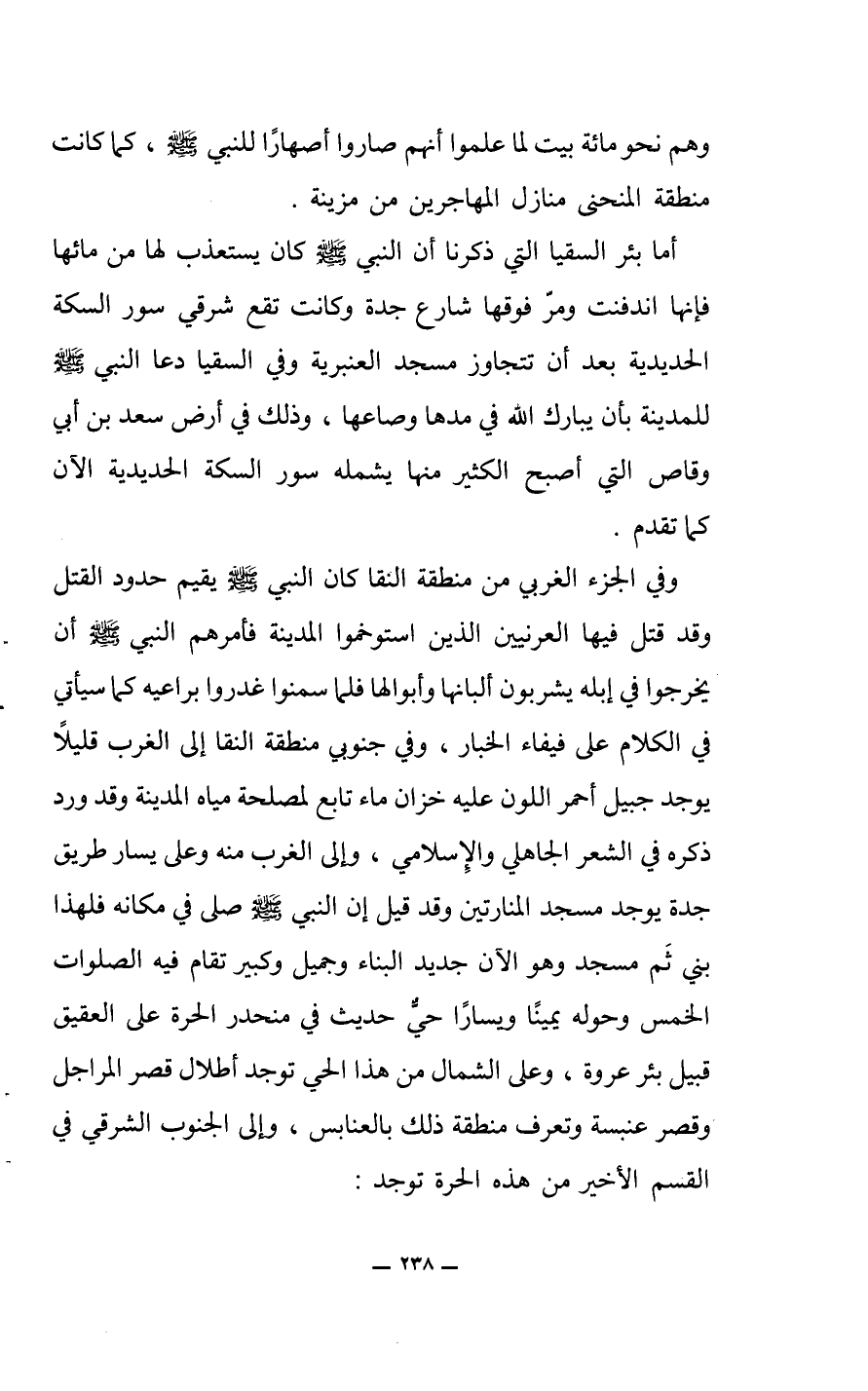 وفي الجزء الغربي من منطقة النقا كان النبي صلى الله عليه وسلم يقيم حدود القتل وقد قتل فيها العرنيين الذين استوخموا المدينة فأمرهم النبي صلى الله عليه وسلم أن يخرجوا في إبله يشربون ألبانها وأبوالها فلما سمنوا غدروا براعيه كما سيأتي في الكلام على فيفاء الخبار، وفي جنوبي منطقة النقا إلى الغرب قليلْ يوجد جبيل أحمر اللون عليه خزان ماء تابع لمصلحة مياه المدينة وقد ورد ذكره في الشعر الجاهلي والإسلامي، وإلى الغرب منه وعلى يسار طريق جدة يوجد مسجد المنارتين وقد قيل إن النبي صلى الله عليه وسلم صلى في مكانه فلهذا بني ثم مسجد وهو الآن جديد البناء وجميل وكبير تقام فيه الصلوات الخمس وحوله يميناً ويساراً حي حديث في منحدر الحرة على العقيق قبيل بئر عروة، وعلى الشمال من هذا الحي توجد أطلال قصر المراجل وقصر عنبسة وتعرف منطقة ذلك بالعنابس، وإلى الجنوب الشرقي في القسم الأخير من هذه الحرة توجد:…
