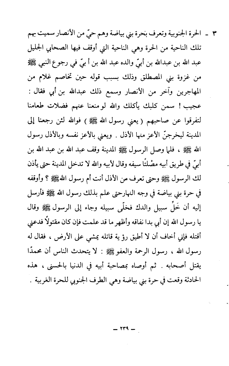 3 - الحرة الجنوبية وتعرف بحرة بني بياضة وهم حي من الأنصار سميت بهم تلك الناحية من الحرة وهي الناحية التي أوقف فيها الصحابي الجليل عبد الله بن عبد الله بن أبي والده عبد الله بن أبي في رجوع النبي صلى الله عليه وسلم من غزوة بني المصطلق وذلك بسبب قوله حين تخاصم غلام من المهاجرين وآخر من الأنصار وسمع ذلك عبد الله بن أبي فقال: عجيب! سمن كلبك يأكلك والله لو منعنا عنهم فضلات طعامنا لتفرقوا عن صاحبهم (يعني رسول الله ص) فوالله لئن رجعنا إلى المدينة ليخرجن الأعز منها الأذل.