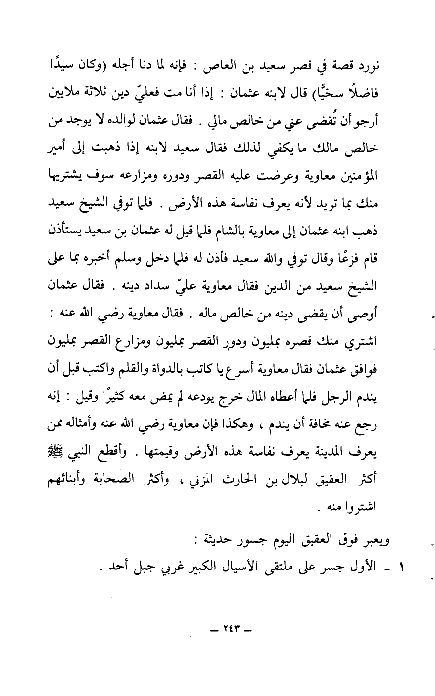 فقال معاوية رضي الله عنه: اشتري منك قصره بمليون ودور القصر بمليون ومزارع القصر بمليون فوافق عثمان فقال معاوية أسرع يا كاتب بالدواة والقلم واكتب قبل أن يندم الرجل فلما أعطاه المال خرج يودعه لم يمض معه كثيراً وقيل: إنه رجع عنه مخافة أن يندم، وهكذا فإن معاوية رضي الله عنه وأمثاله ممن يعرف المدينة يعرف نفاسة هذه الأرض وقيمتها.