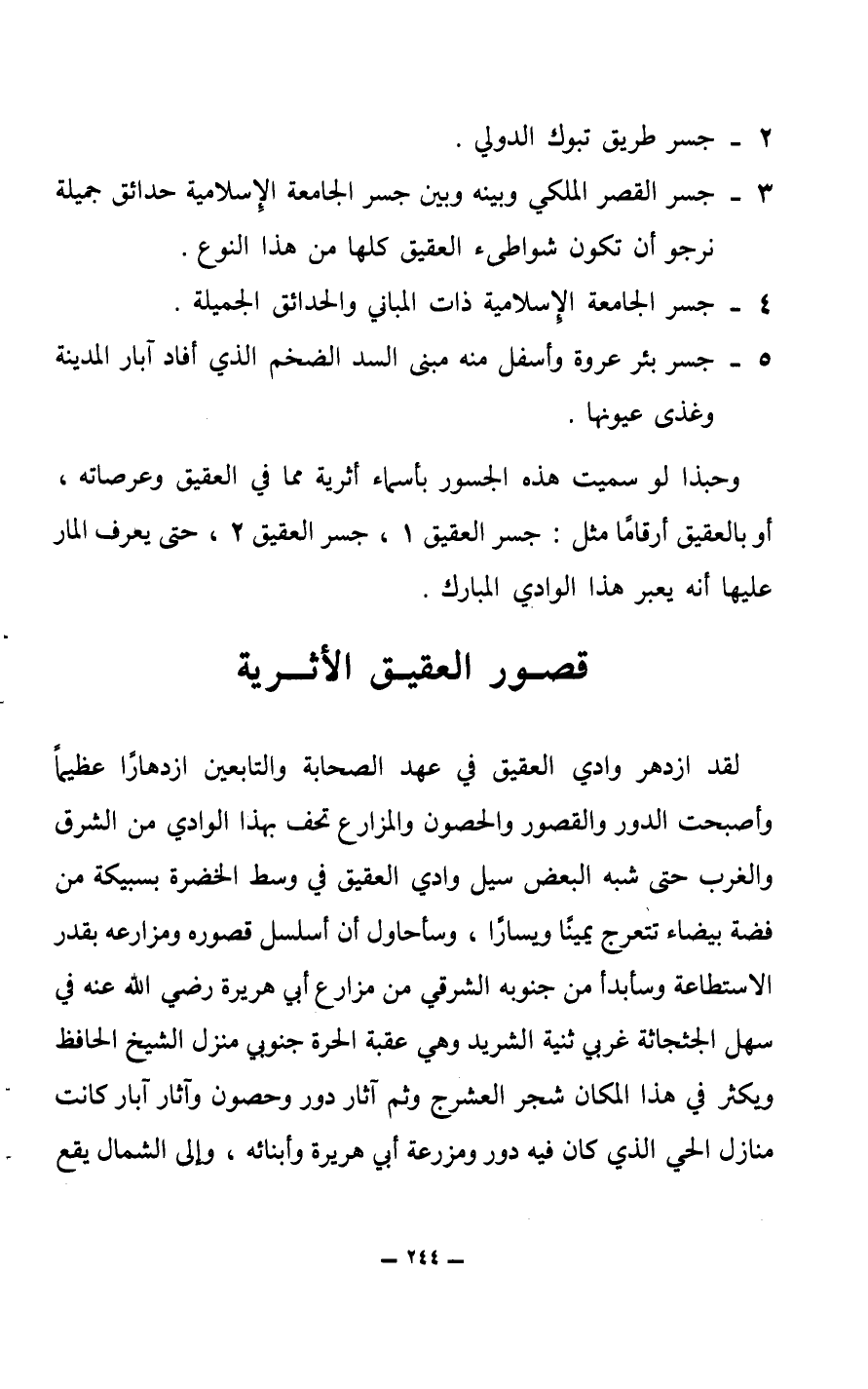 لقد ازدهر وادي العقيق في عهد الصحابة والتابعين ازدهاراً عظيماً وأصبحت الدور والقصور والحصون والمزارع تحف بهذا الوادي من الشرق والغرب حتى شبه البعض سيل وادي العقيق في وسط الخضرة بسبيكة من فضة بيضاء تتعرج يميناً ويساراً، وسأحاول أن أسلسل قصوره ومزارعه بقدر الاستطاعة وسأبدأ من جنوبه الشرقي من مزارع أبي هريرة رضي الله عنه في سهل الجثجاثة غربي ثنية الشريد وهي عقبة الحرة جنوبي منزل الشيخ الحافظ ويكثر في هذا المكان شجر العشرج وثم آثار دور وحصون وآثار آبار كانت منازل الحي الذي كان فيه دور ومزرعة أبي هريرة وأبنائه، وإلى الشمال يقع…