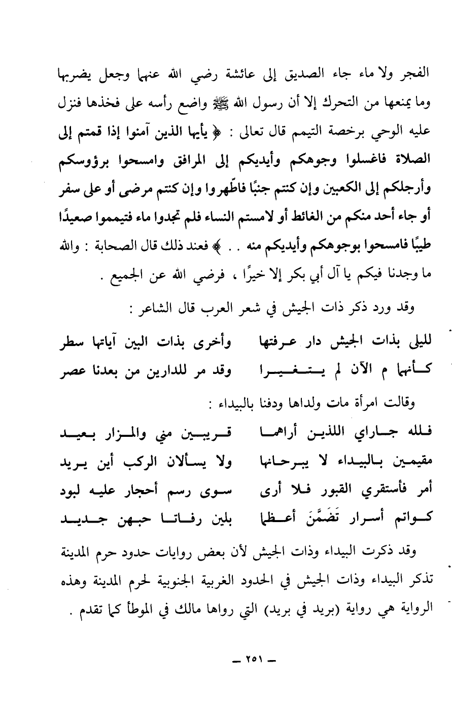 الفجر ولا ماء جاء الصديق إلى عائشة رضي الله عنهما وجعل يضربها وما يمنعها من التحرك إلا أن رسول الله صلى الله عليه وسلم واضع رأسه على فخذها فنزل عليه الوحي برخصة التيمم قال تعالى: (يأيها الذين آمنوا إذا قمتم إلى الصلاة فاغسلوا وجوهكم وأيديك إلى المرافق وامسحوا برؤوسكم وأرجلكم إلى الكعبين وإن كنتم جنباً فاطهروا وإن كنتم مرضى أو على سفر أو جاء أحد من الغائط أو لامستم النساء فلم تجدوا ماء فتيمموا صعيداً طيباً فامسحوا بوجوهكم وأيديكم منه .. ) فعند ذلك قال الصحابة: والله ما وجدنا فيكم يا آل أبي بكر إلا خيراً، فرضي الله عن الجميع.